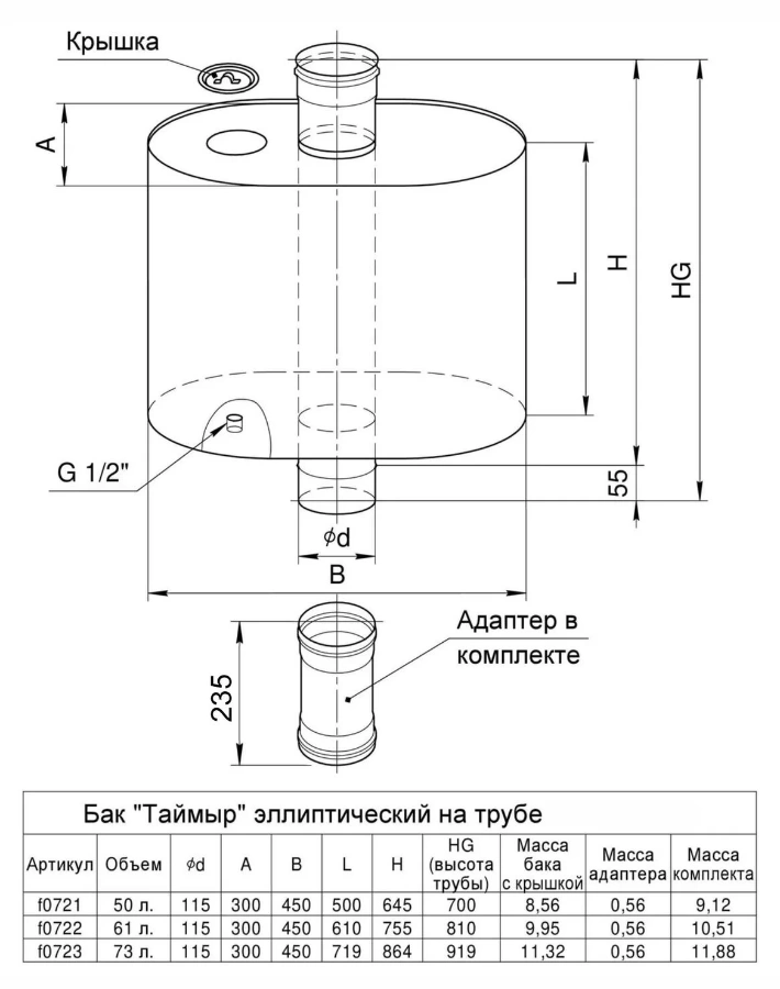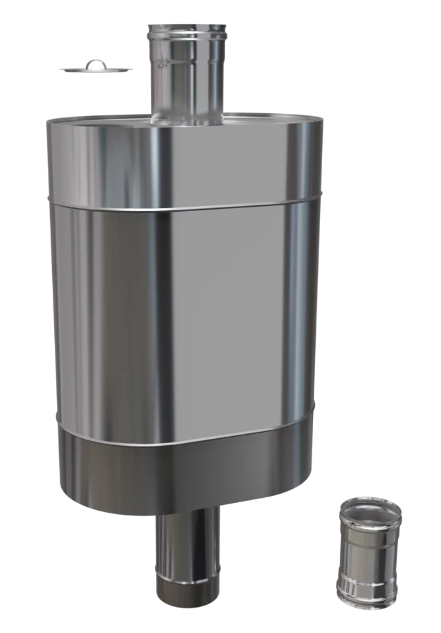 Бак Ferrum Таймыр эллиптический на трубе 61 литров на трубе 115мм. используется для нагрева воды от уходящих газов дровяной банной печи. Устанавливается на патрубок дымохода печи. Представляет собой емкость через которую проходит труба дымохода. Высота трубы дымохода 810 мм, труба установлена по конденсату. В комплекте адаптер ММ, высотой 235мм. Бак изготовлен из нержавеющей стали марки AISI 201 и толщиной 1мм. Верхняя плоскость бака и крышка заливного отверстия изготовлены из нержавеющей стали марки AISI 430, толщиной 0,8мм.