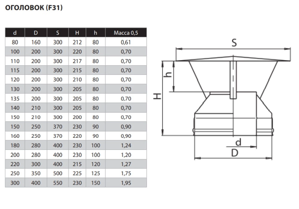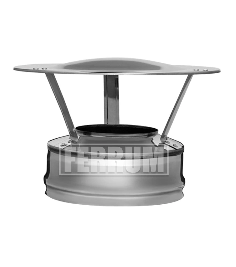 Оголовок Ferrum (430/0,5мм + оц.) Ф150х210 - это финишный элемент сэндвич дымохода, закрывает торец сэндвич трубы и препятствует попаданию влаги в дымоход. Внутренняя труба изготовлена из нержавеющей стали марки AISI 430 толщиной 0,5мм. Материал внешний трубы оцинкованная сталь толщиной 0,5мм.