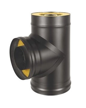 Сэндвич-тройник BLACK (AISI 430/0,8мм) 90* д.150х250мм применяется для изгиба прямых участков сэндвич-дымохода, подключения нескольких печей к одной системе дымоотведения или организации прочистного отверстия. Используется при сборки дымохода для дровяных печей, печей-каминов и котлов. С другими деталями дымохода Везувий, того же диаметра, соединяется с помощью раструбов. Внутренняя труба изготовлена из нержавеющей стали AISI 430 толщиной 0,8 мм. Продольные сварные швы выполнены TIG старкой, тонкий ровный по всей длине. В качестве теплоизоляции используется базальтовая вата. С внешней стороны сэндвич-тройник имеет термостойкое покрытие черного цвета. Температурный режим работы, до 600 °С. Допускается кратковременный нагрев до 800 °С.