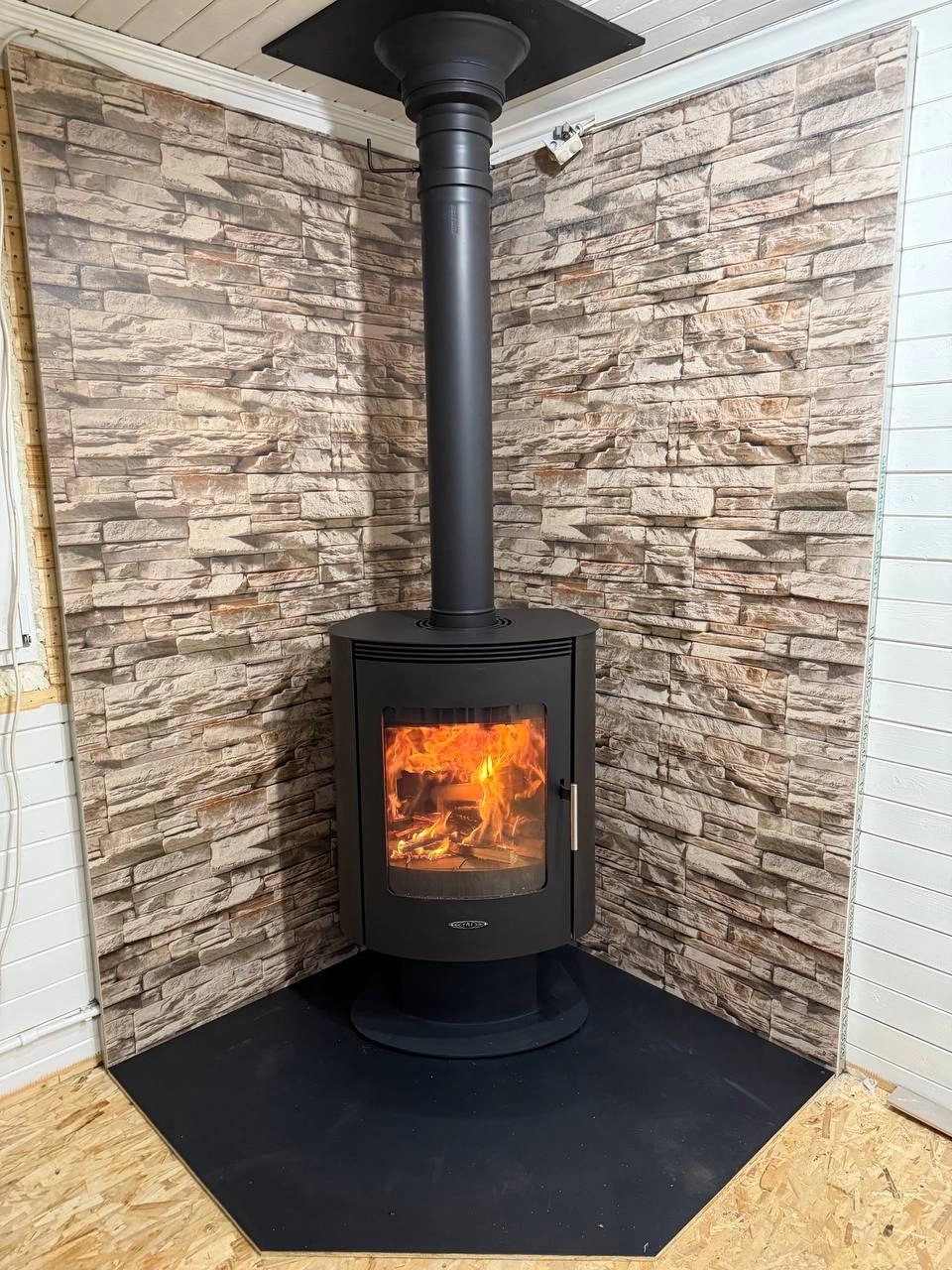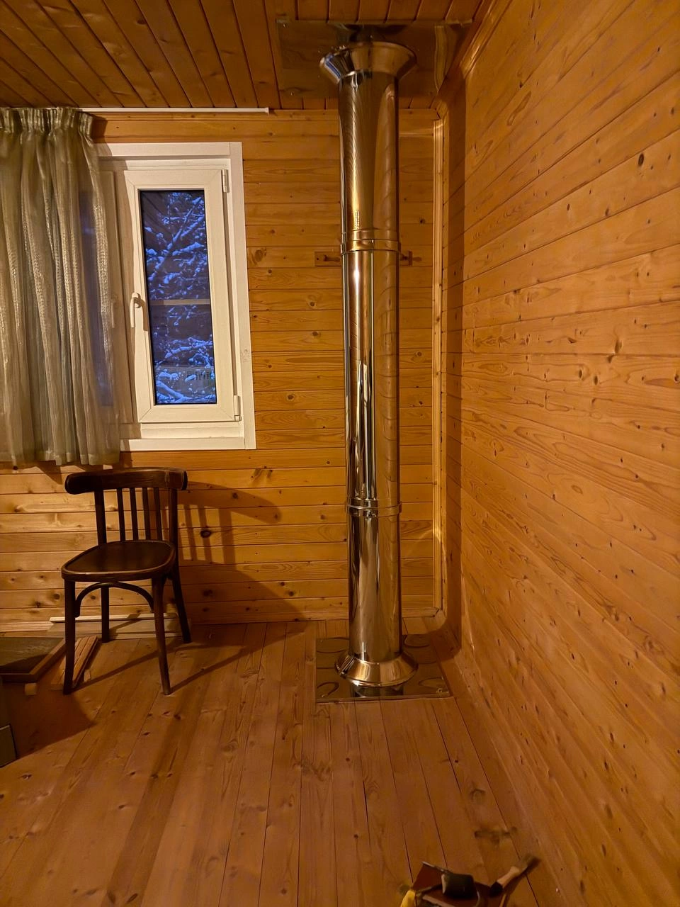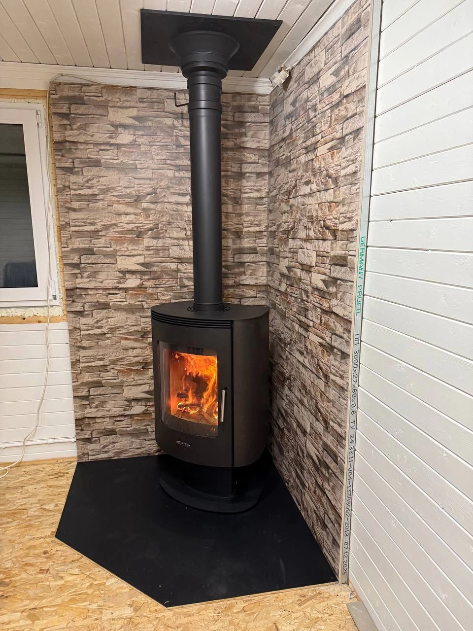 Монтаж дровяной печи-камина Визиера на напольный экран чёрного цвета и дымохода. Монтаж вертикальной системы дымохода через два этажа и ломаную крышу дачного дома. Горение дров, проверка тяги в дымоходе.