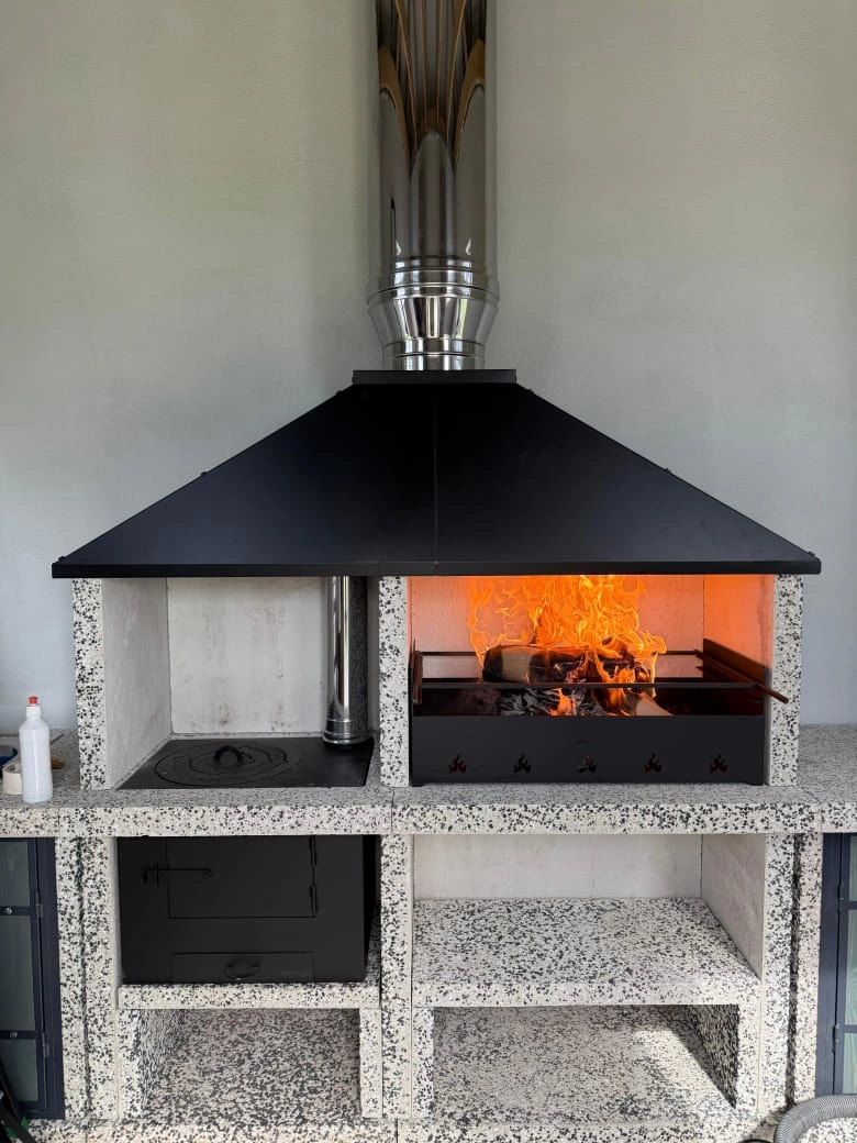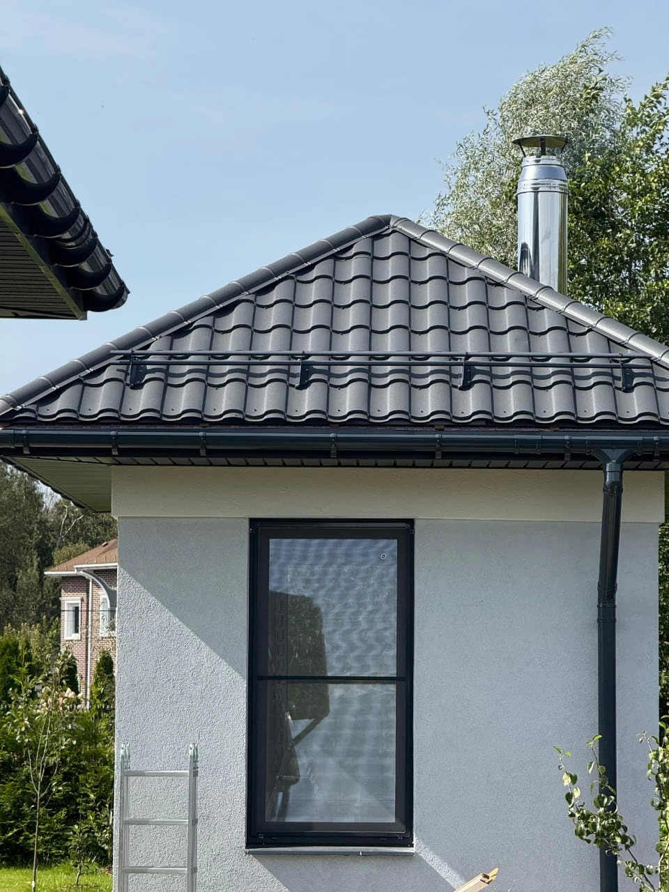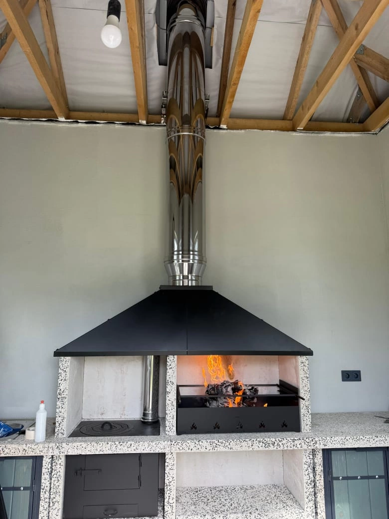 Установка дымохода к барбекю с вертикальным выводом в крышу, герметизация кровли мастер флешем.