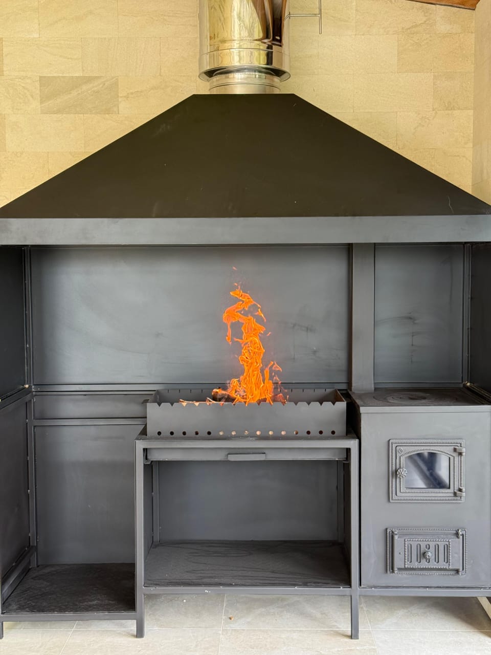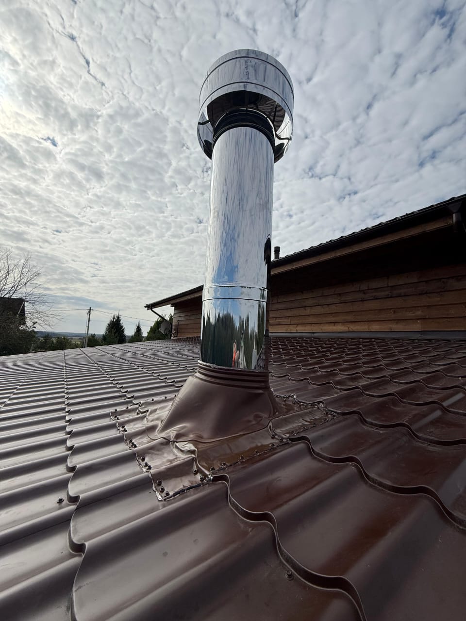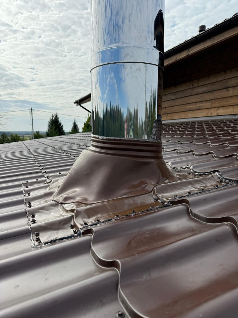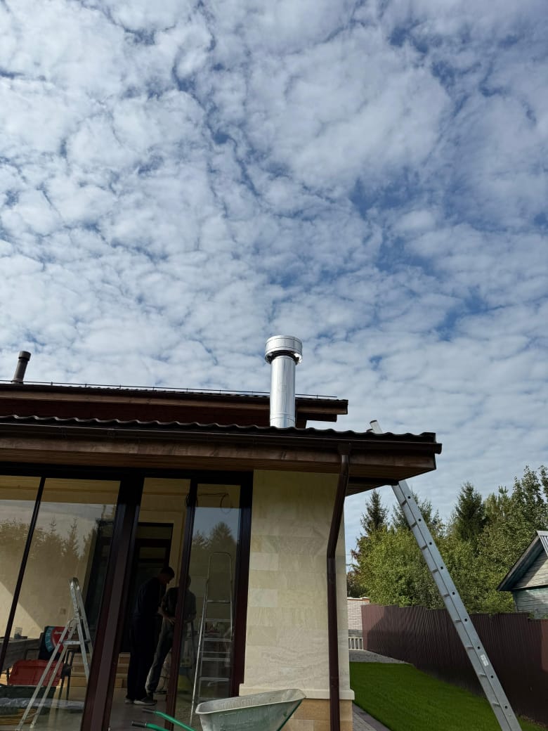 Установка и монтаж дымохода для стационарного мангала и печи под казан уличной кухни с вертикальным выводом в крышу, герметизация кровли мастер флешем.