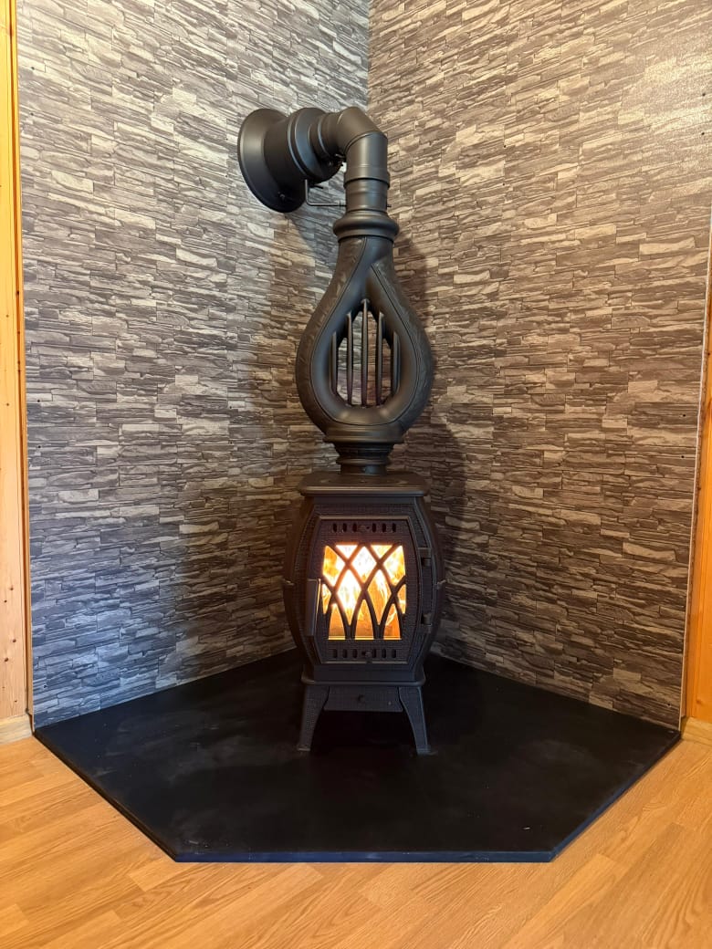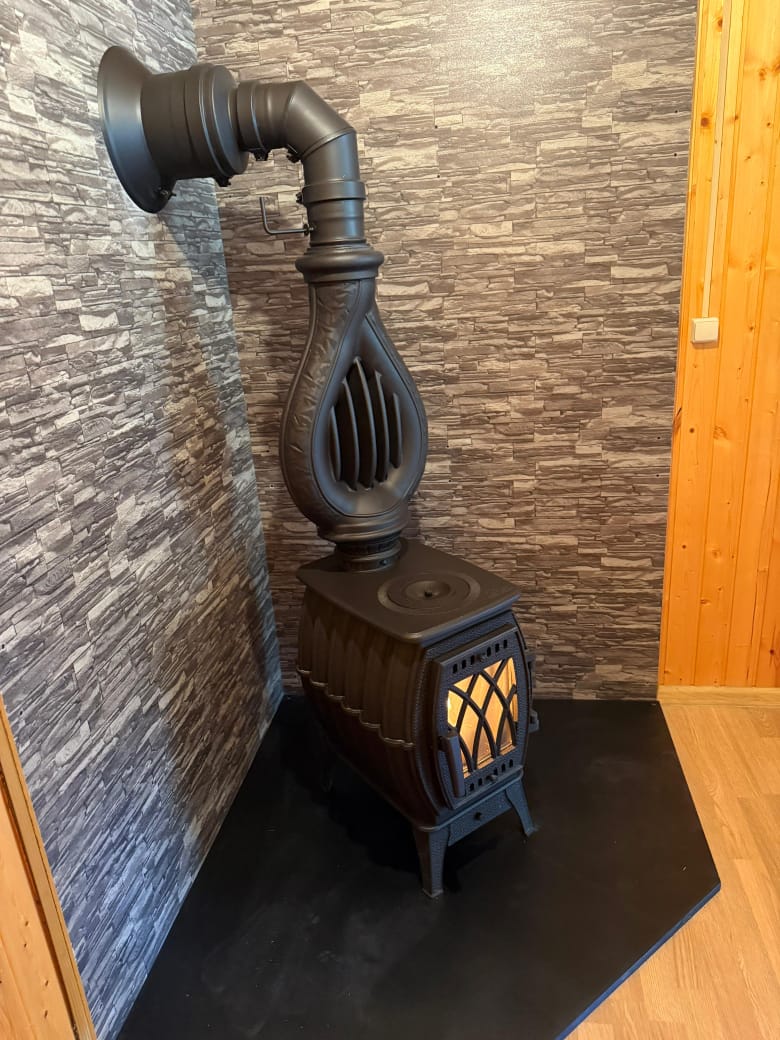 Монтаж печи Бахта с чугунным конвектором Лира в углу помещения с выводом черного дымохода в стену.