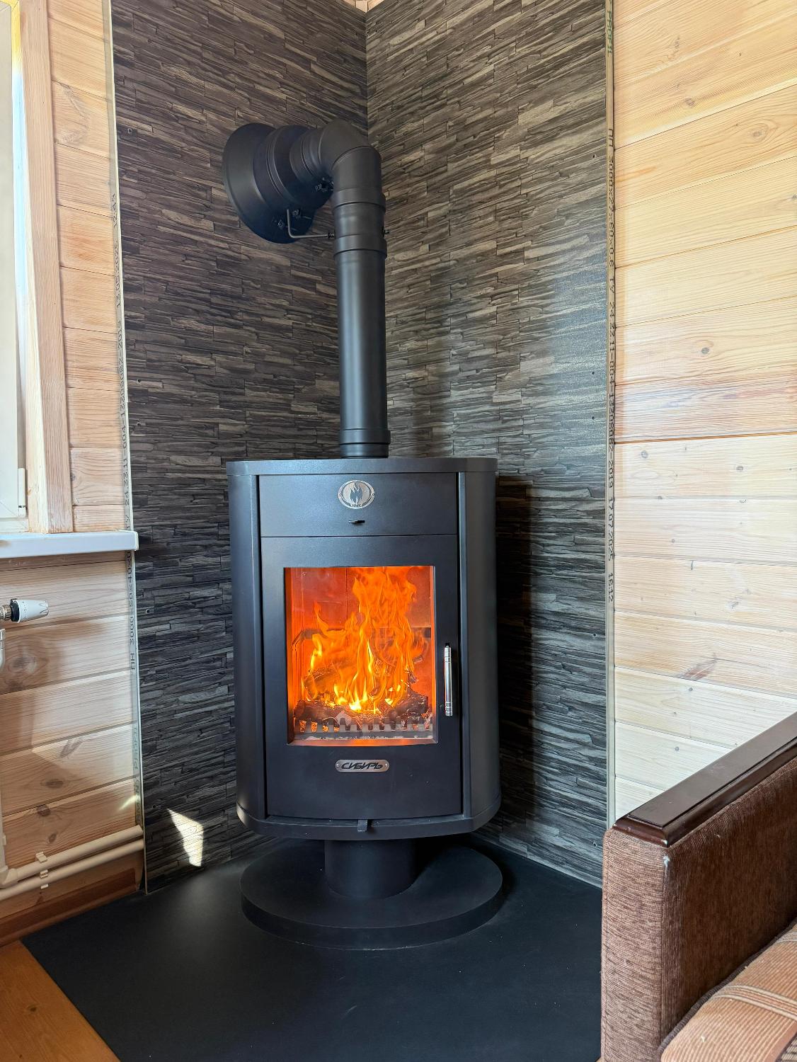 Выполнили монтаж печи-камина Сибирь 10 стальная на ножки. Установка производилась в угол комнаты. Стены закрыли не горючими панелями и рисунком. Под панелями базальтовым картоном, через воздушный зазор. Дымоход, по желанию заказчика, вывели в стену. Внутри дымоход черного цвета, на улице из полированной нержавеющей стали. На улице дымоход пришлось изогнуть, чтобы не закрывать окно.