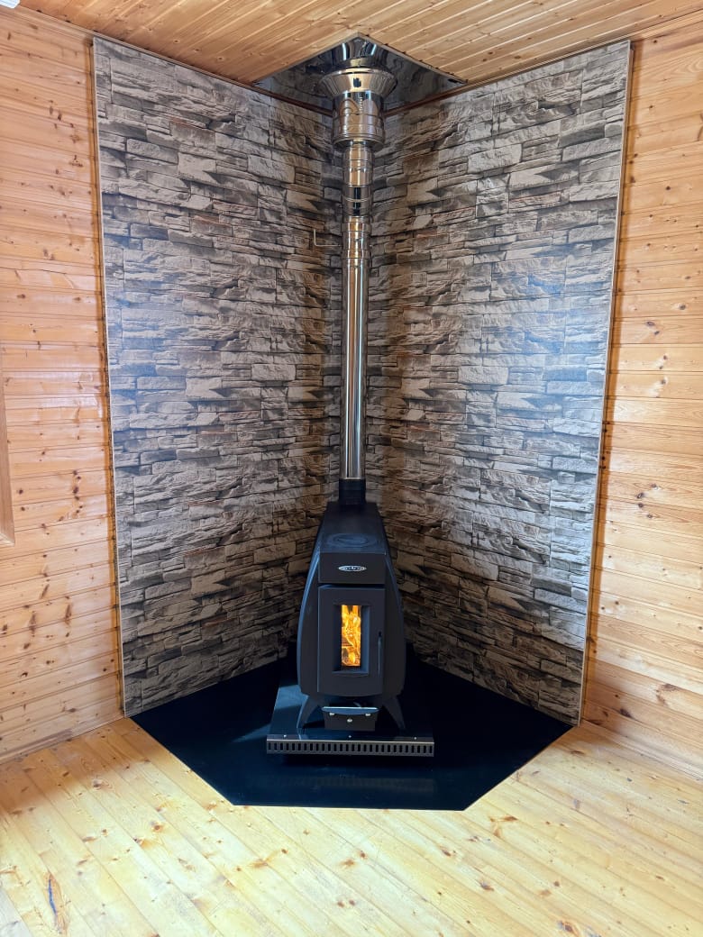 Монтаж печи TMF Огонь-батарея 11 в углу комнаты и выводом дымохода через крышу, отделка стен огнестойкими листами Флама дизайн с рисунком.
