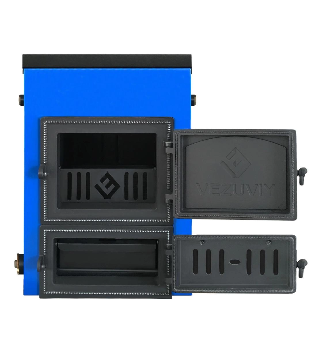 Топка котла Везувий Эльбрус-18 из котловой стали толщиной 3,5мм. С лицевой стороны две чугунные герметичные дверки. Верхняя используется для загрузки и розжига топлива, нижняя для доступа к зольному ящику. Водяная рубашка котла по периметру теплоизолированна базальтовым картоном и закрыта стальным кожухом покрашенным синий краской. В верхней части котла расположен термометр. Подключение дымохода к котлу горизонтальное, рядом с патрубком дымохода есть прочистной люк.