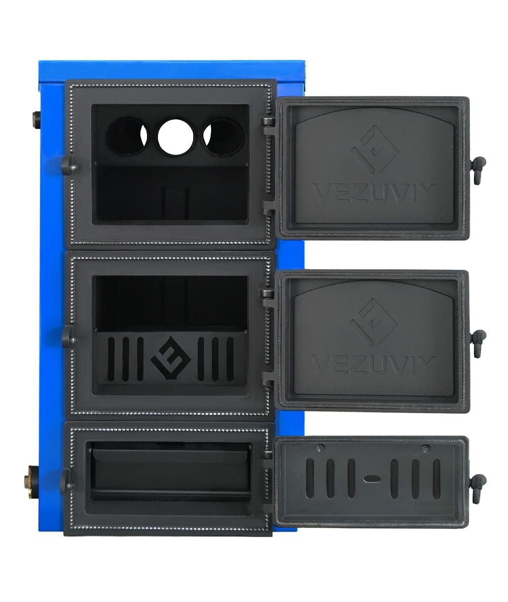 С лицевой стороны котла Везувий Олимп-30 три чугунные герметичные дверки. Верхняя используется для загрузки топлива, средняя для розжига топлива, нижняя для доступа к зольному ящику. Водяная рубашка котла по периметру теплоизолированна базальтовым картоном и закрыта стальным кожухом покрашенным синий краской. Подключение дымохода к котлу горизонтальное, рядом с патрубком дымохода есть прочистной люк.