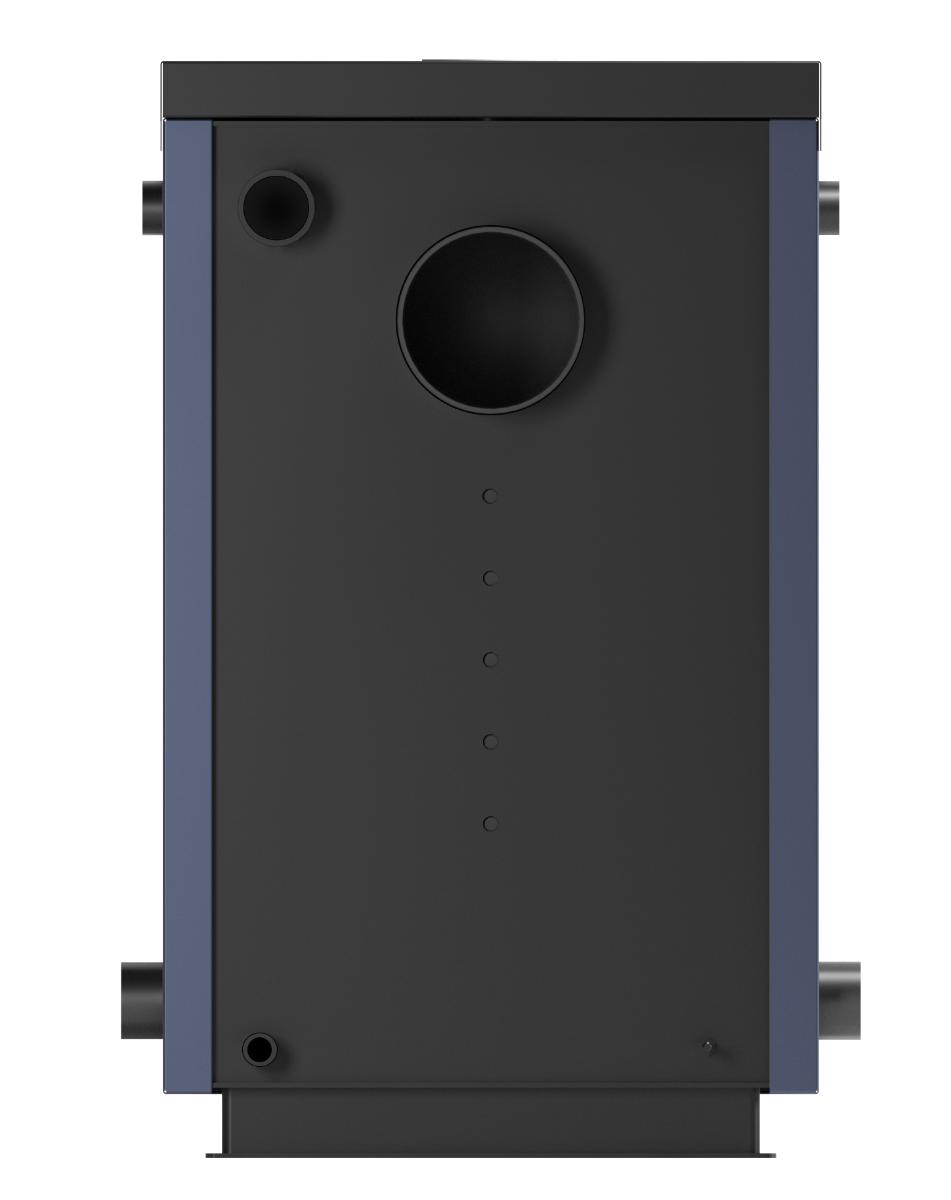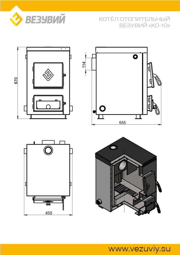 Топка котла Везувий КО - 10 из котловой стали толщиной 3 мм. На задней стенки топки канал вторичного воздуха. С лицевой стороны две стальные герметичные дверки. Верхняя дверка используется для загрузки и розжига топлива, размер загрузочной дверки 23х27см. Нижняя для доступа к зольному ящику. Водяная рубашка котла по периметру теплоизолированна базальтовым картоном и закрыта стальным кожухом покрашенным серой краской. В верхней части котла расположен термометр. Подключение дымохода к котлу горизонтальное.