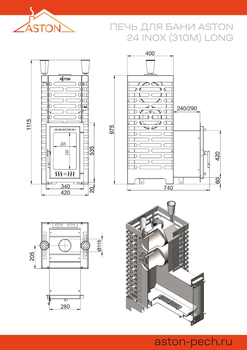 Aston 24 (310М) Long – это банная печь с закрытой каменкой от компании Aston для парильных помещений с объемом до 26 м3. Топка печи изготовлены из стали марки 09Г2С толщиной 4мм. Закрытая каменка из стали марки 09Г2С толщиной 4-8мм