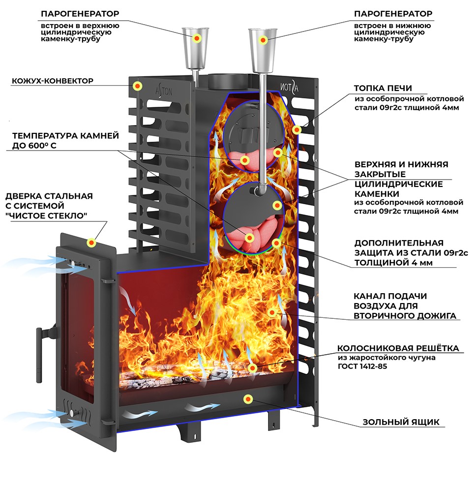 Основным преимуществом печи Aston 24 (310М) Long являются две встроенные закрытые каменки цилиндрической формы. Встроенные каменки расположены в зоне высоких температур, их стенки, и камни внутри, нагреваются до 600 градусов Цельсия. Закрытые каменки, суммарно, вмещают 30 кг. камней. Вода на камни подается через две воронки.