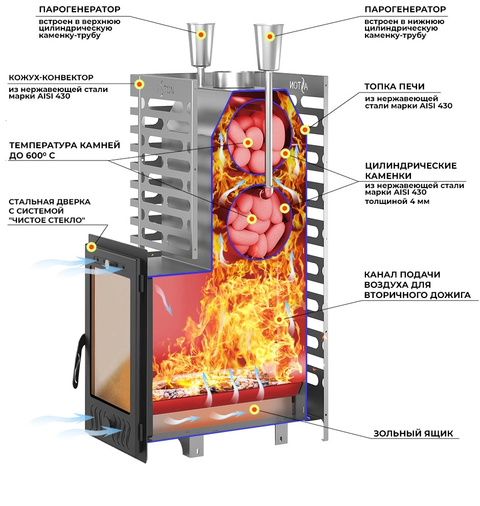 Основным преимуществом печи Aston 24 Inox (310М) являются две встроенные закрытые каменки цилиндрической формы. Встроенные каменки расположены в зоне высоких температур, их стенки, и камни внутри, нагреваются до 600 градусов Цельсия. Закрытые каменки, суммарно, вмещают 30 кг. камней. Вода на камни подается через две воронки.