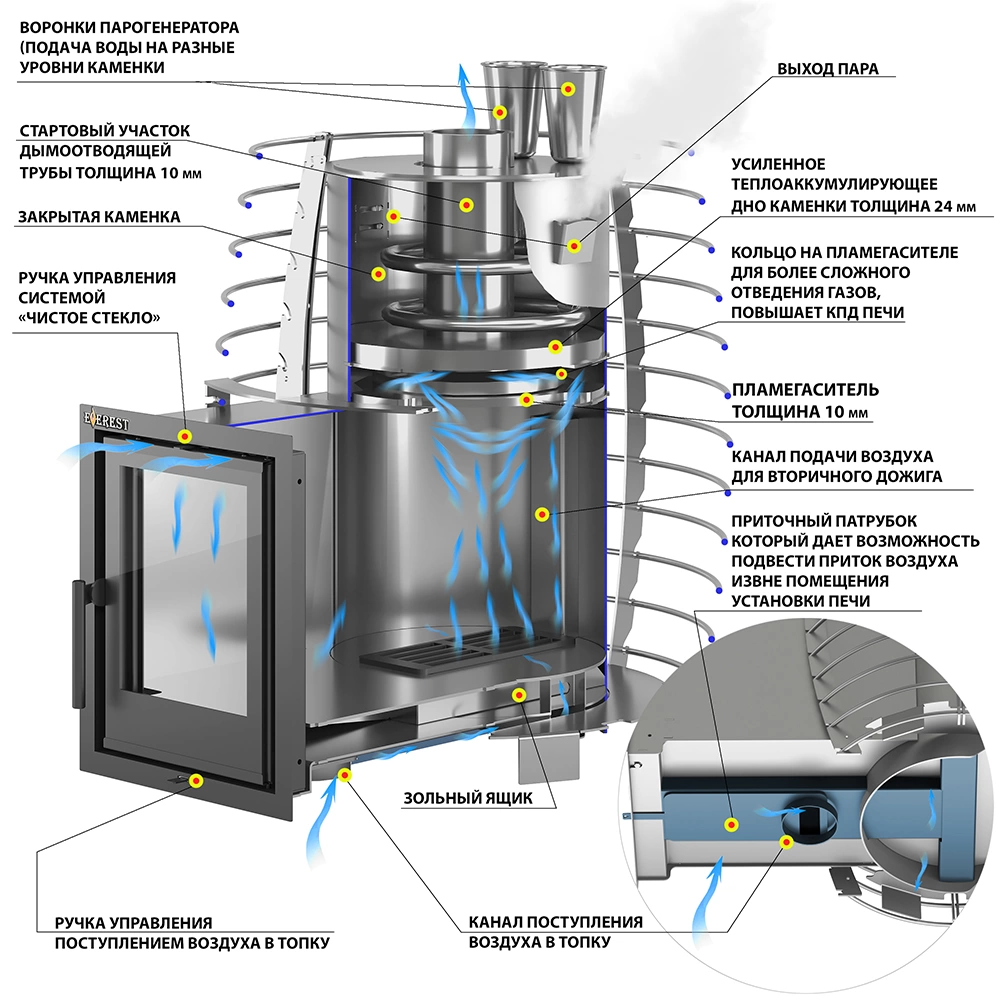 У печи Эверест Steam Heat 24 inox б/в две воронки для воды. И это не просто удобство.