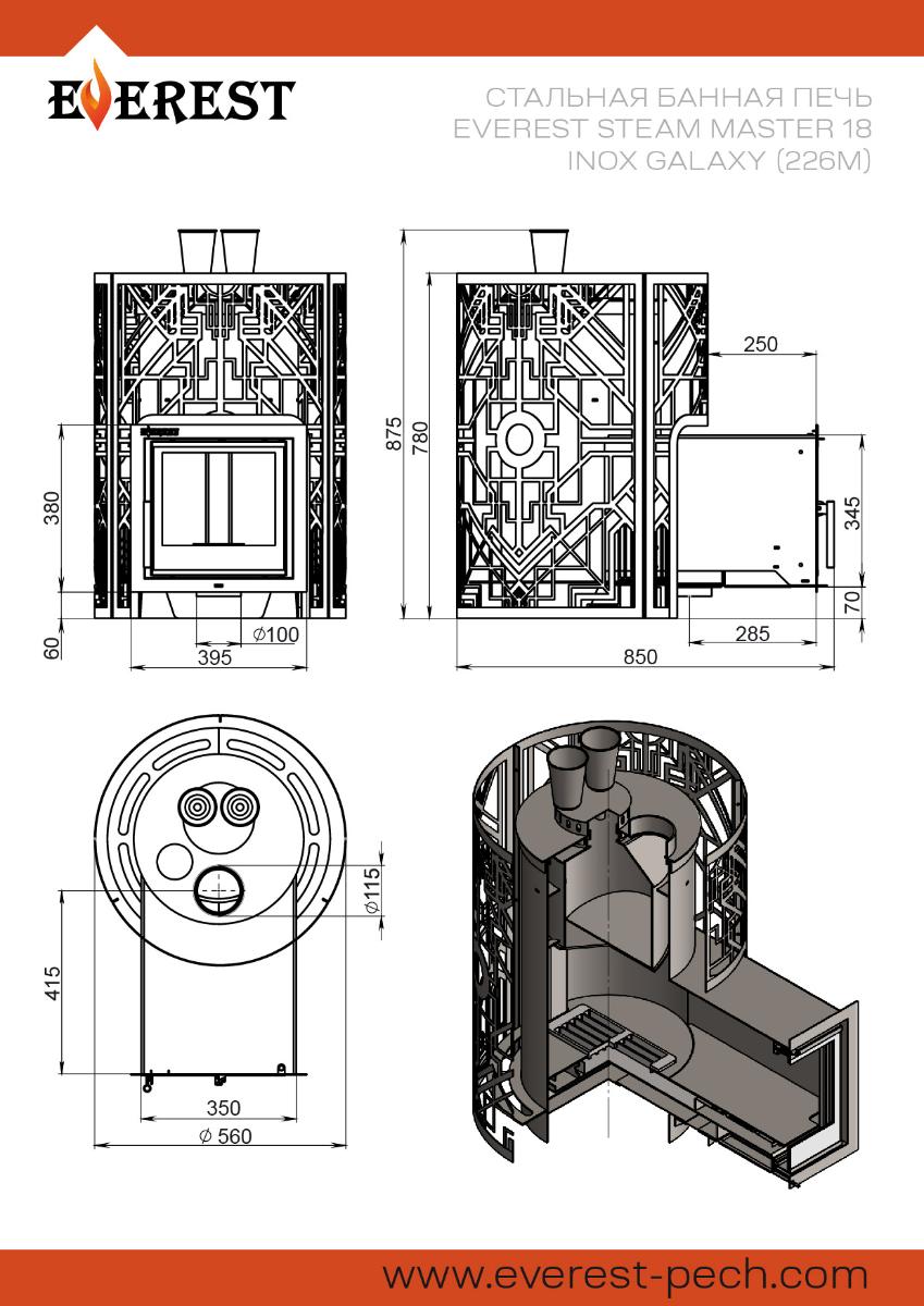 Печь Эверест Steam Master Galaxy 18 Inox (226М) для бани, с топкой из нержавеющей стали, с закрытой каменкой, на дровах.