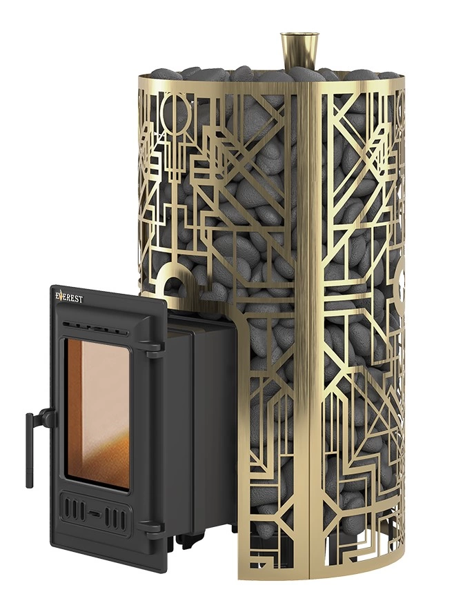 Внешний контур печи выполнен в виде минималистичной сетки из нержавеющей стали толщиной 1 мм. с покрытием цвета Gold, что делает печь Эверест Steam Master Galaxy 20 (310) Чугун Gold не только функциональным, но и эстетически привлекательным элементом вашей бани.