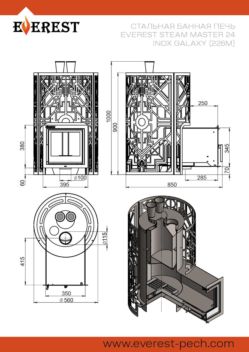 Печь Эверест Steam Master Galaxy 24 Inox (226М) для бани, с топкой из нержавеющей стали, с закрытой каменкой, на дровах.