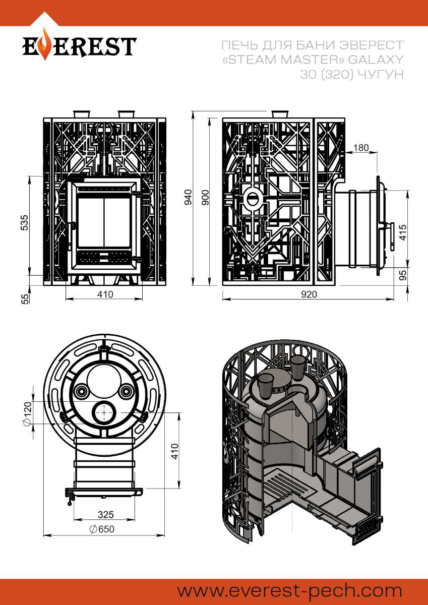 Печь Эверест Steam Master Galaxy 30 (320) Чугун для бани, с закрытой каменкой, на дровах