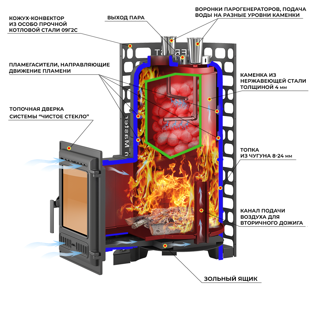 Верхняя часть топки печи Steam Master Galaxy 30 (320) Чугун выполнена из чугунных колец. Цилиндрическая топочная камера оснащена чугунным колосником размером 20 на 30 см, который обеспечивает оптимальный доступ воздуха в нижний участок топки, для обеспечения эффективного горения дров. Забор воздуха происходит через щелевидные отверстия в двери печи. Для увеличения КПД и полноты сгорания топлива система вторичного дожига подаёт воздух в верхние точки топки, что обеспечивает максимальную эффективность процесса.Чугунная дверь (артикул 320) оборудована двумя системами подачи воздуха, которые позволяют регулировать интенсивность горения и предотвращают затемнение стекла. Герметичное примыкание дверки, к дверной рамки, обеспечивает контролируемое горение и перевод печи в разные режимы работы.