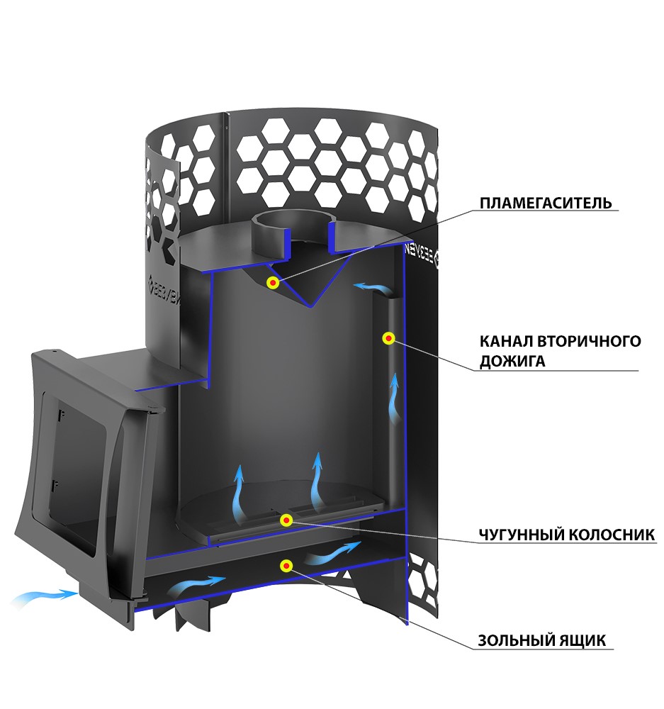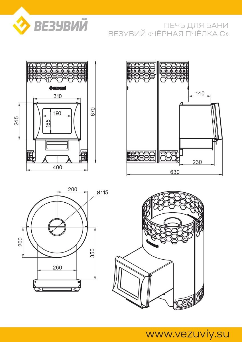 Везувий Чёрная Пчёлка С — это банная дровяная с открытой каменкой, для парильных помещений объемом до 14 м3. Топка печи изготовлена из стали марки 09Г2С толщиной 3-4 мм. Топка с вторичным дожигом. Колосниковая решетка чугунная. Печь имеет выносной канал для загрузки дров в топку. Такая конструкция позволяет топить печь из прилегающего к парилки помещения. Длинна выносного канала для загрузки топлива 140мм. Топка печи Везувий Чёрная Пчёлка С по периметру окружена конвектором. Конвектор цилиндрической формы с вырезами в форме пчелиных сот. Конвектор выступает выше топки, формируя каменку для камней (камни приобретаются отдельно). Камни аккумулируют тепло и позволяют получать пар. Топочная дверка печи 310х245мм. стальная, со стеклом. Топочная дверка крепится к выносному каналу загрузки дров под углом, это исключает ее произвольное открытие. Дверка открывается справа на лево и слева на право, в зависимости от удобства пользования и установки оси петель.