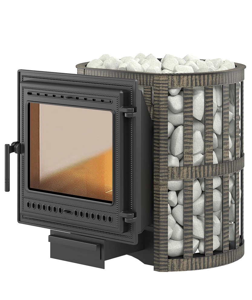 Легенда Ковка 16 (505) — это банная дровяная печь для парильных помещений с объемом до 18 м3. Топка печи, отбойник пламени, колосниковая решетка и дверца топки изготовлены из чугуна (ГОСТ 1412-85). Толщина топки 8мм. Печь имеет выносной канал для загрузки дров в топку. Такая конструкция позволяет топить печь из прилегающего к парилки помещения. Длинна выносного канала для загрузки топлива 220мм. Выносной канал изготовлен из стали. Топка печи Легенда Ковка 16 (205) по периметру окружена конвектором. Конвектор изготовлен из стальных кованых полос. Пространство между конвектором и топкой заполняется банным камнем. Камни аккумулируют тепло, снижают тепловое излечение топки и позволяют получать пар. Топочная дверка печи 500х500мм. Размер стекла 364х280мм.