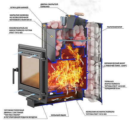 Топка печи Везувий Ураган 22 (505) из чугунных деталей (ГОСТ 1412-85) соединенных друг с другом болтами. Между деталями прокладка из не горючего шнура. Топка закрыта сетчатым конвектором из кованных полос металла. Сетчатый конвектор заполняется банными камнями. Камни снимают тепловое излучение топки. Канал закладки дров в печь с удлинением 220 мм., поэтому топочную дверку можно вынести из парильного помещения. Дверка печи герметичная чугунная со стеклом 364х280 мм.