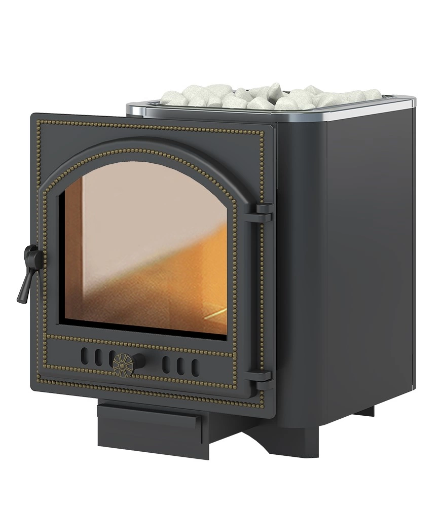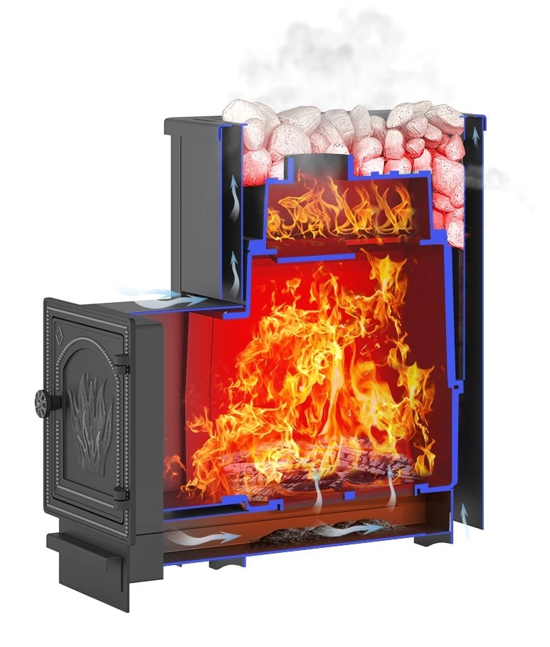 Печь Везувий Сенсация Антрацит 16 (224) — это банная печь на дровах для парильных помещений объемом до 18 м3. Каменка печи открытая, через каменку проходит нагретые потоки воздуха, это позволяет нагревать камни до температуры 350 °С. Топка печи изготовлена из чугуна СЧ-20. По периметру закрыта конвектором, покрашенным черной термостойкой краской. Колосниковая решетка и топочная дверка чугунные. Сенсация Антрацит 16 (224) с выносным каналом загрузки дров в топку. Это позволяет топить печь из прилегающего к парилки помещения. Длинна выносного канала для закладки дров 200мм.