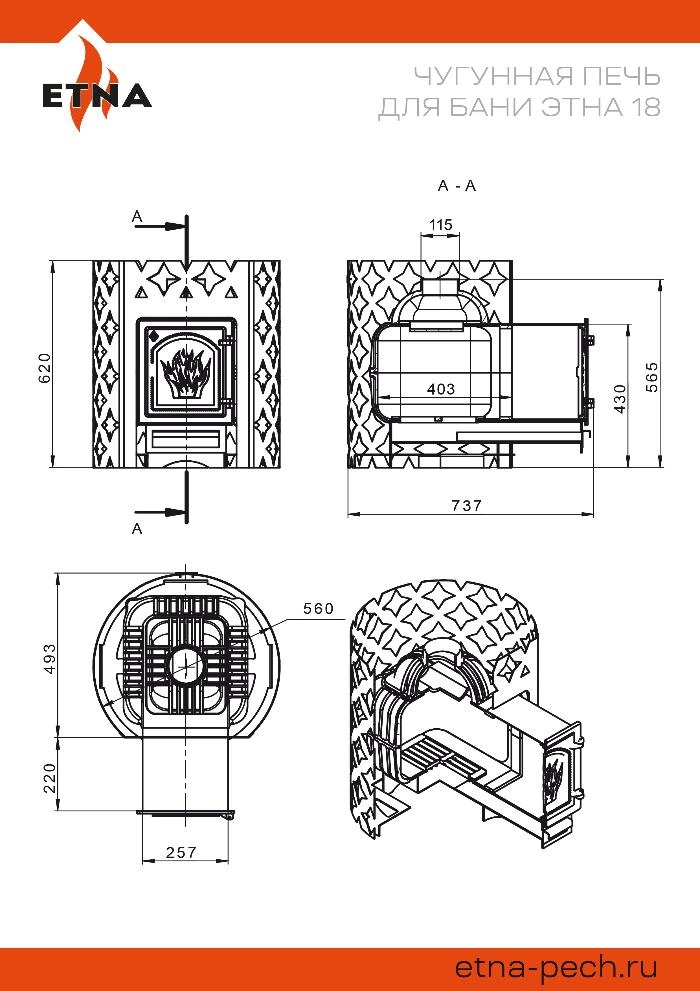 Топка печи Этна 18 (ДТ-4) чугунная, состоит из нескольких деталей. Детали соединены болтами, между деталями негорючий шнур. Толщина стенок топки 6-8мм. Для увеличения прочности, топка по периметру имеет оребрение. Топка закрыта стальным конвектором с прорезями в форме четырехугольных звезд. Конвектор до верха заполняется банными камнями, вмещает 100кг камней. Дверка печи Этна 18 (ДТ-4) глухая чугунная, с элементами художественного литья.