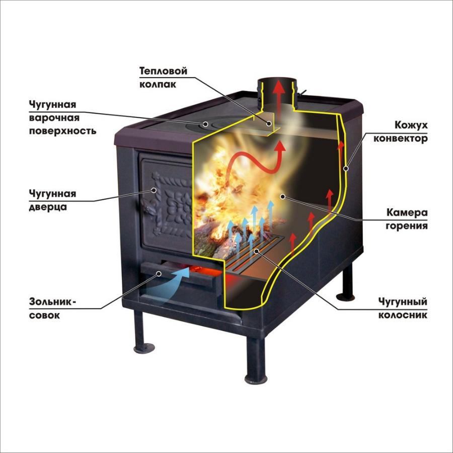 Топка печи стальная, с толщиной деталей до 4мм. На дне топки чугунный колосник, под колосником располагается выдвижной зольный ящик. В верхней части топки расположен рассекатель пламени. По периметру топка закрыта конвекторов. Дверка печи Stoker Cадовая ПО–150 ЧП чугунная без стекла с механизмом запирания. Верхняя плоскость печи оборудована плитой с двумя съемными элементами. Плита используется для разогрева и приготовления пищи.