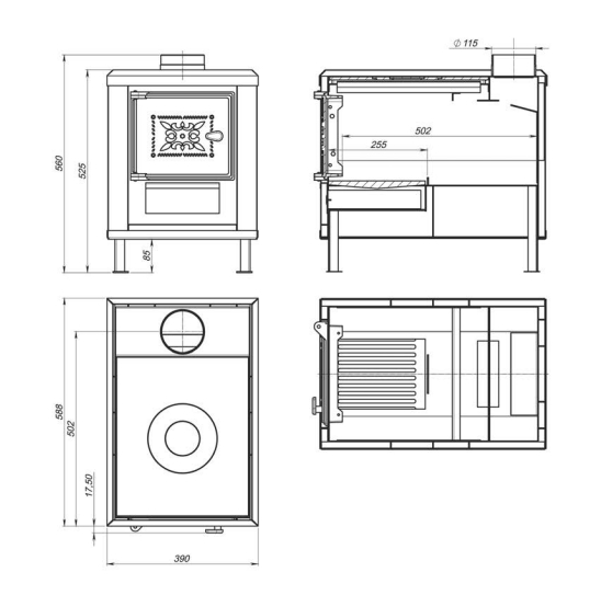 Дымоход к печи подсоединяется сверху, диаметр подсоединяемого дымохода 115 мм.