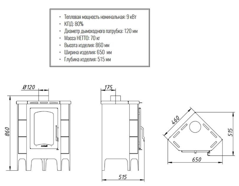 Печь-камин Бавария Угловая артикул PK145 – это отопительная печь-камин компании Экокамин мощностью 9 кВт для угловой установки.