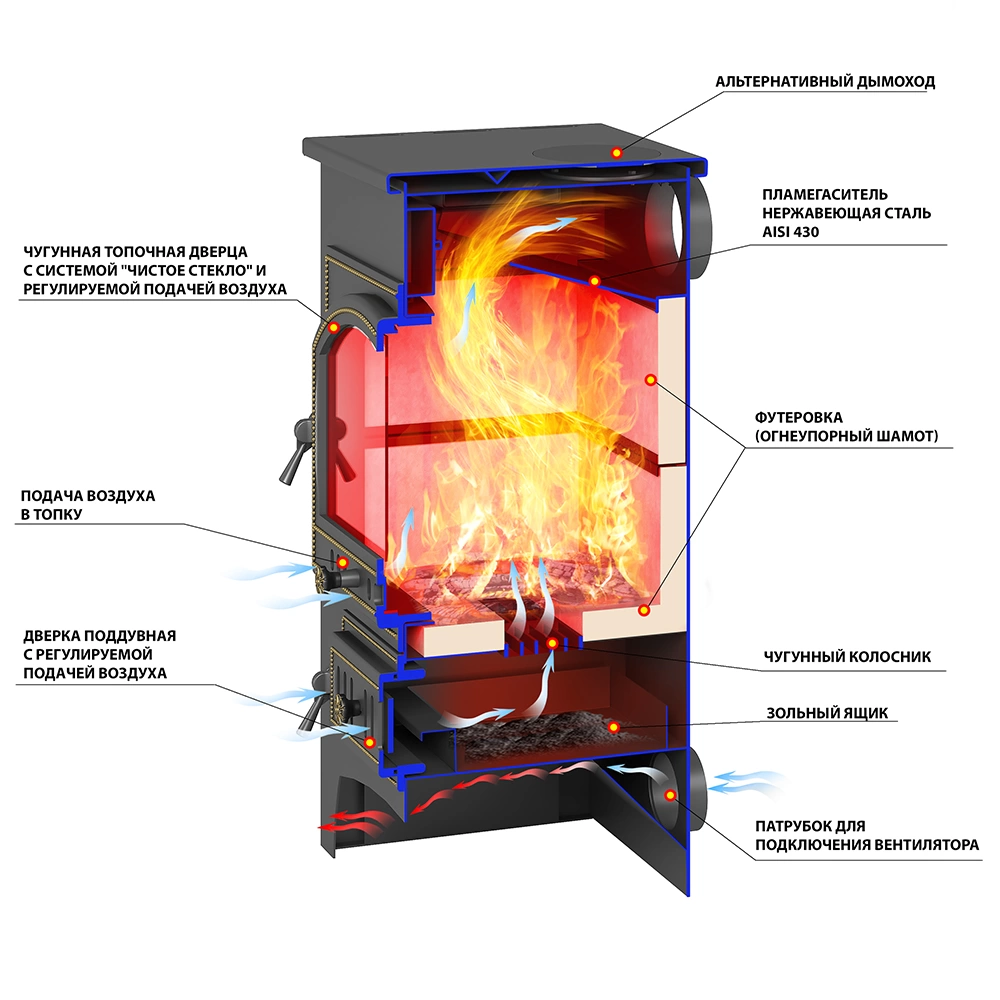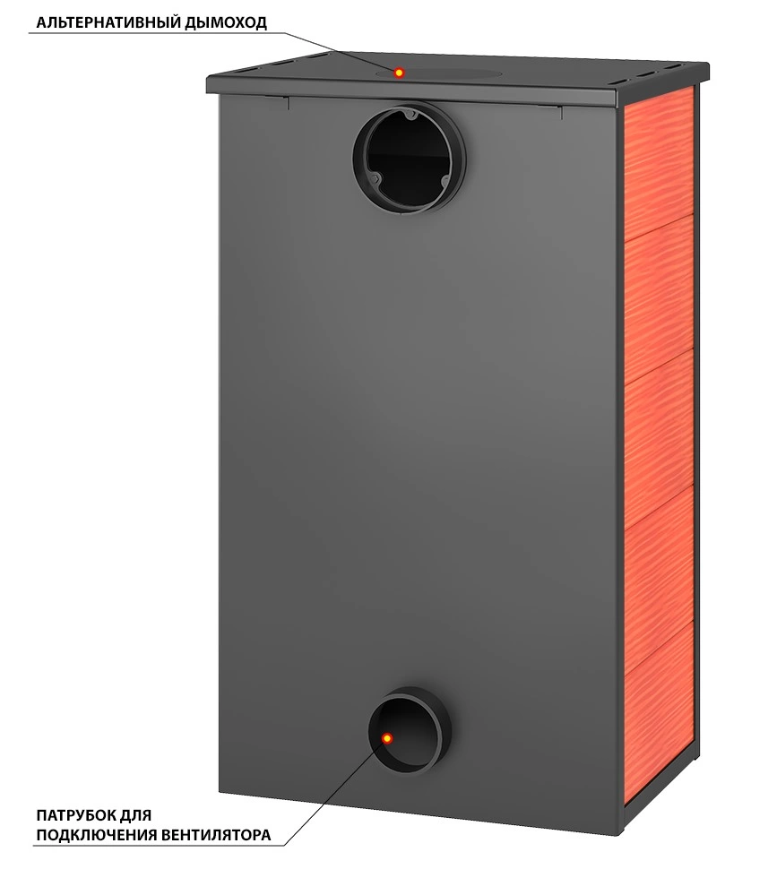 Печь-камин Везувий ПК-01 (205) красная - это отопительная печь-камин для отопления помещений с объемом до 200 м3.Топка печи-камина Везувий ПК-01 (205) красная стальная. Дно топки, боковые стороны и задняя стенка закрыты шамотным кирпичом. Отбойник пламени из нержавеющей стали толщиной 2 мм. Топочная дверка и дверка зольного ящика чугунные. Топочная дверка с уплотнением из керамического шнура, размер стекла в дверки 317х365 мм. Поддувальная дверка с механизмом регулировки подачи воздуха в топку. С боковых сторон печь-камин имеет конвектора со вставками из керамической плитки. В нижней части задней стенки расположен патрубок для установки вентилятора. Вентилятор продувает воздух между топкой и конвекторами, ускоряя нагрев помещения. Вентилятор приобретается отдельно.