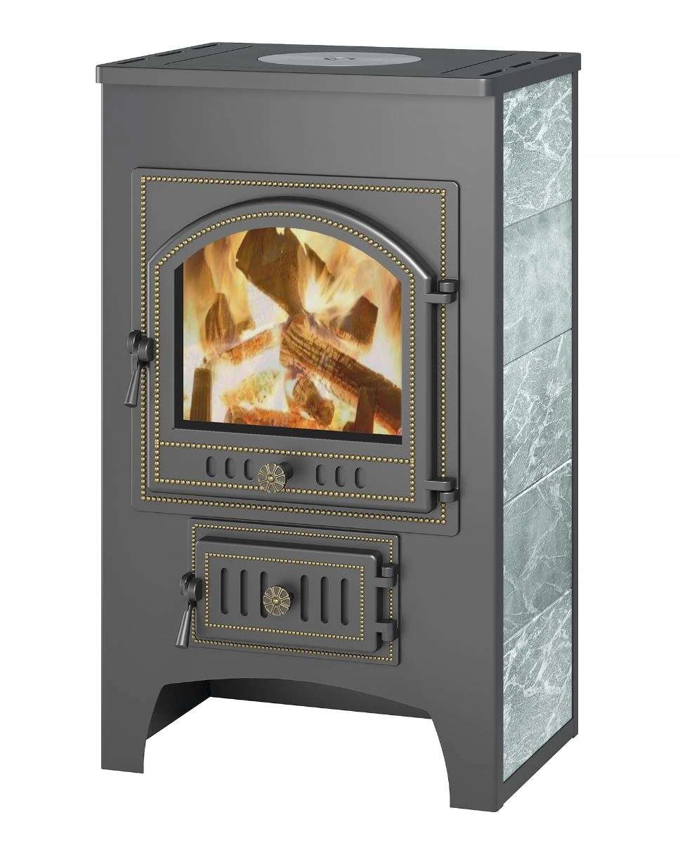 Печь-камин Везувий ПК-01 (205) с плитой талькохлорит - это отопительно-варочный печь-камин для приготовления пищи и отопления помещений с объемом до 200 м3.Топка печи-камина Везувий ПК-01 (205) с плитой талькохлорит стальная. Дно топки, боковые стороны и задняя стенка закрыты шамотным кирпичом. Отбойник пламени из нержавеющей стали толщиной 2 мм. Варочная плита, колосник, топочная дверка и дверка зольного ящика чугунные. Топочная дверка с уплотнением из керамического шнура, размер стекла в дверки 317х365 мм. Поддувальная дверка с механизмом регулировки подачи воздуха в топку. С боковых сторон печь-камин имеет конвектора со вставками из из натурального камня талькохлорита. Варочная плита с одной съемной конфоркой. Место примыкания варочной плиты к корпусу печь-камина ПК-01 (205) с плитой тальтохлорит уплотнено керамическим шнуром. В нижней части задней стенки расположен патрубок для установки вентилятора. Вентилятор продувает воздух между топкой и конвекторами, ускоряя нагрев помещения. Вентилятор приобретается отдельно.