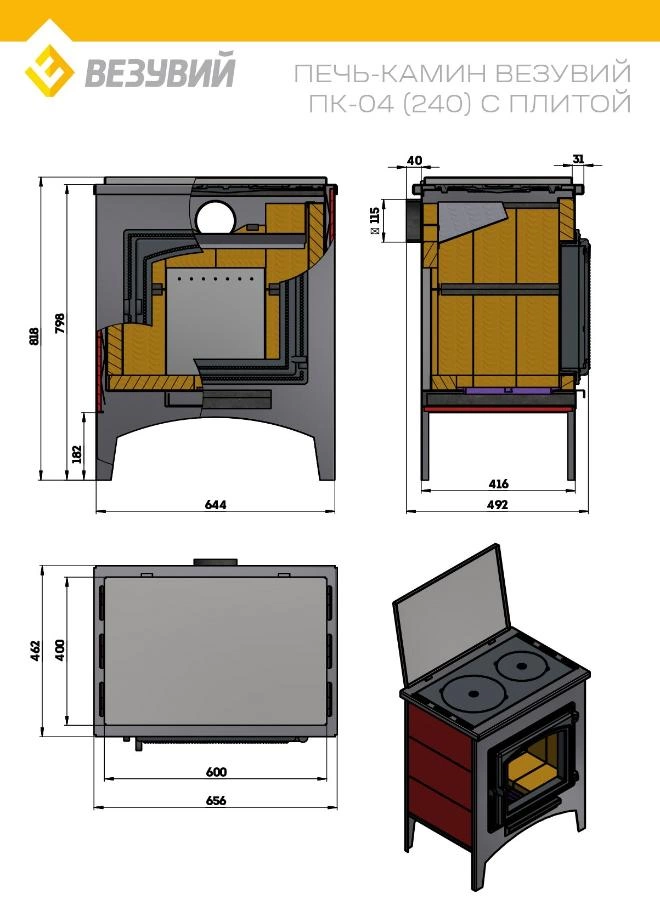 Печь-камин Везувий ПК-04 (240) с плитой амфиболит - это отопительно-варочный печь-камин для приготовления пищи и отопления помещений с объемом до 200 м3.
