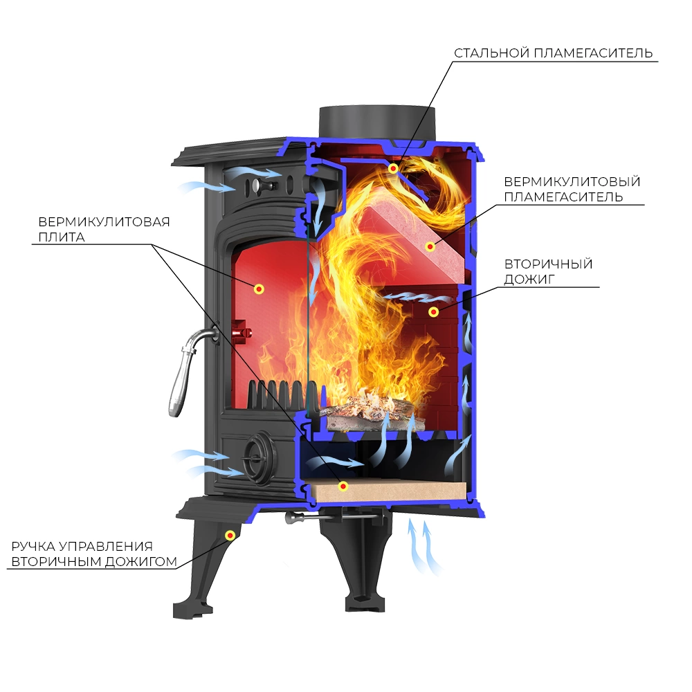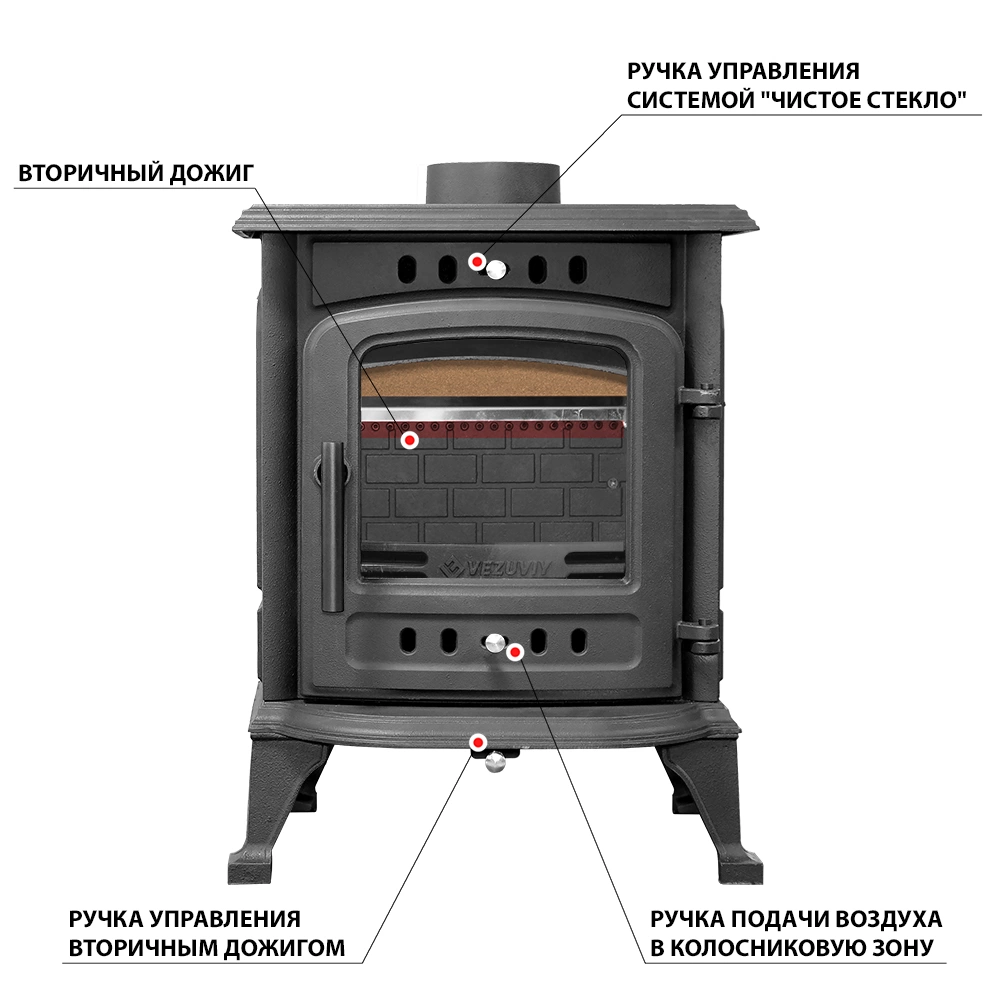 Конструкция: Везувий SV-0 Антрацит состоит из прямоугольной топки на ножках, закрывающийся чугунной дверкой с обзорным стеклом. Дверка дополнена системой "Чистое стекло". Горение дров происходит на колосниковой решётки, под колосниковой решёткой установлен зольный ящик, под зольным ящиком теплоизоляция из листового вермикулита, для снижения тепловой нагрузки на основание печи-камина. Боковые стенки топки, так же закрыты вермикулитовыми вставками. Везувий SV-07 Антрацит имеет нижнюю подачу воздуха, через колосниковую решётку и верхнюю, вторичную подачу воздуха, через отверстия на задней стенки топки. Такая конструкция обеспечивает более полное сгорание дров и повышает КПД печи. Топливо: Печь - камин Везувий SV-07 Антрацит топится сухими дровами или древесными брикетами. Особенности: Везувий SV-07 Антрацит — компактная, современная печь-камин на дровах, для не больших помещений.