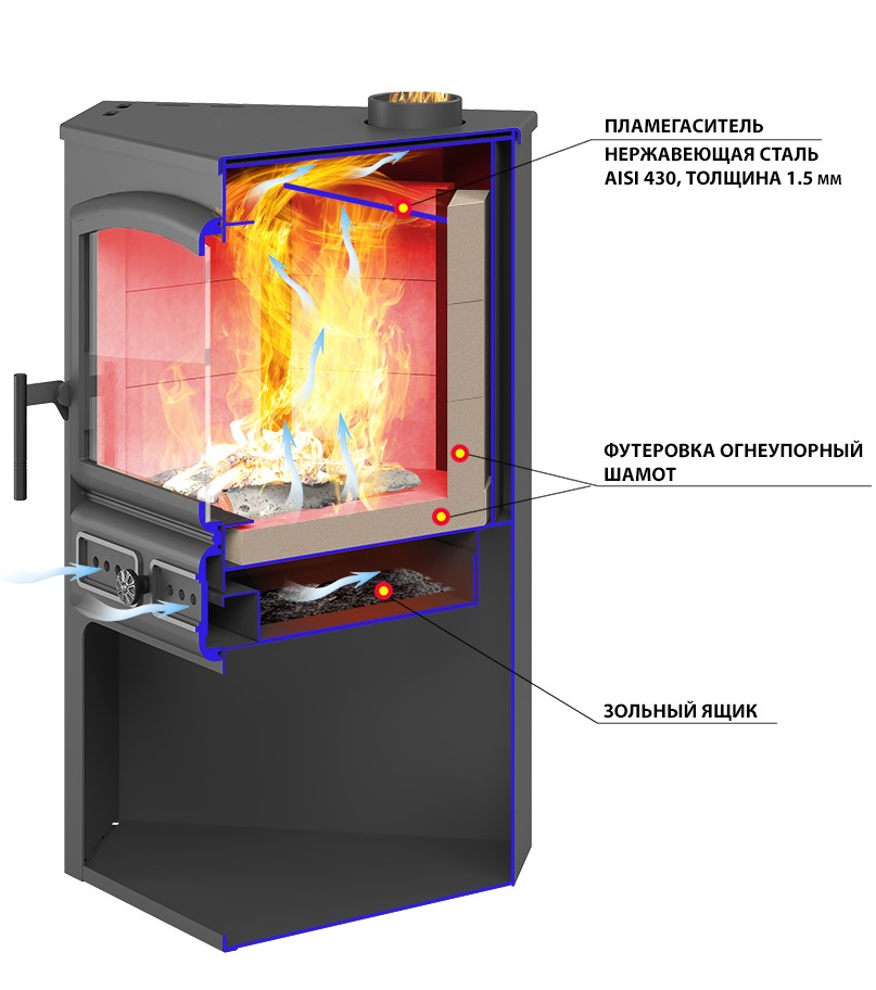 Топится печь-камин сухими дровами или древесно-стружечными брикетами.