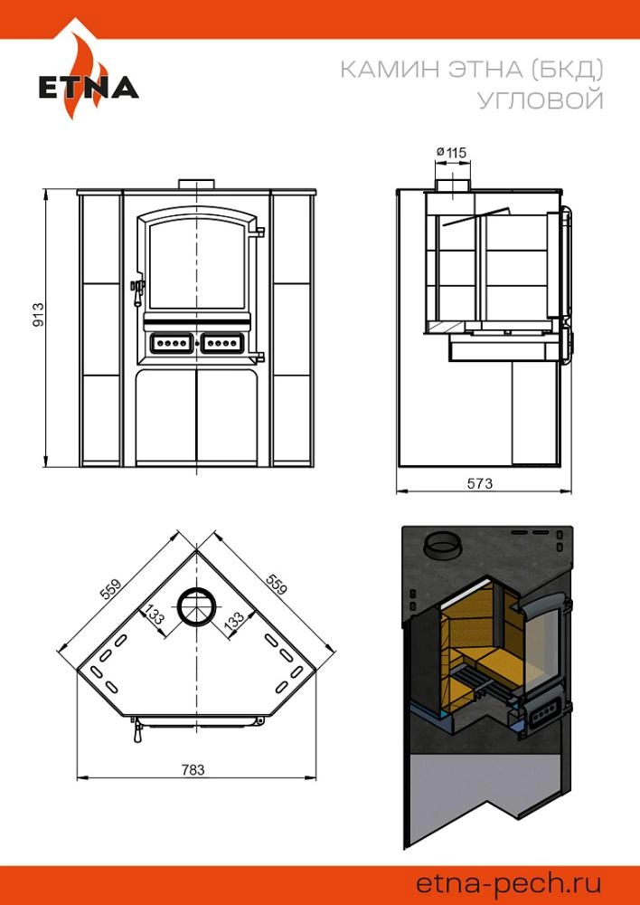 Печь-камин Этна (БКД) угловой Амфиболит предназначен для отопления помещений объемом до 150м3. Мощность печи-камина 11 кВт. Форма печи камина, позволяет установить его в угол помещения.