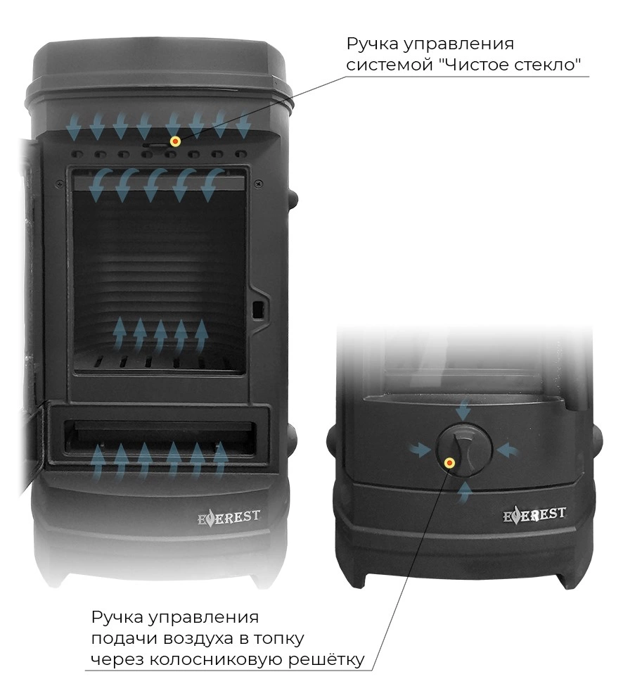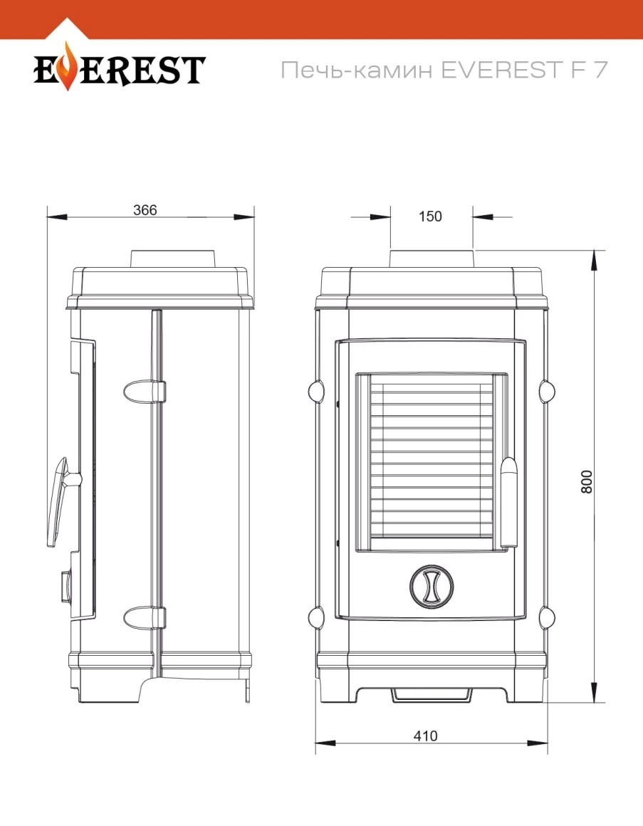 Конструкция: Everest F7 состоит из вытянутой вверх чугунной топки на небольших ножках, закрывающийся чугунной дверкой с обзорным стеклом и системой "Чистое стекло". Горение дров происходит на колосниковой решётки, под колосниковой решёткой установлен зольный ящик. Everest F7 имеет нижнюю подачу воздуха, через колосниковую решётку и верхнюю, через отверстия над топочной дверкой. Такая конструкция обеспечивает более полное сгорание дров и препятствует налипанию сажи на стекло. Топливо: Печь - камин Everest F7 топится сухими дровами или древесными брикетами. Особенности: Everest F7 — баланс габаритов и мощности, надёжности и эффективности для отопления не большого дома и создания атмосферы уюта и стабильности.