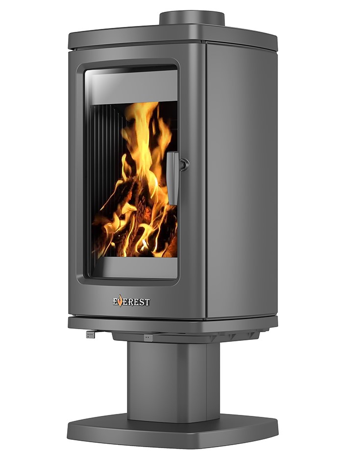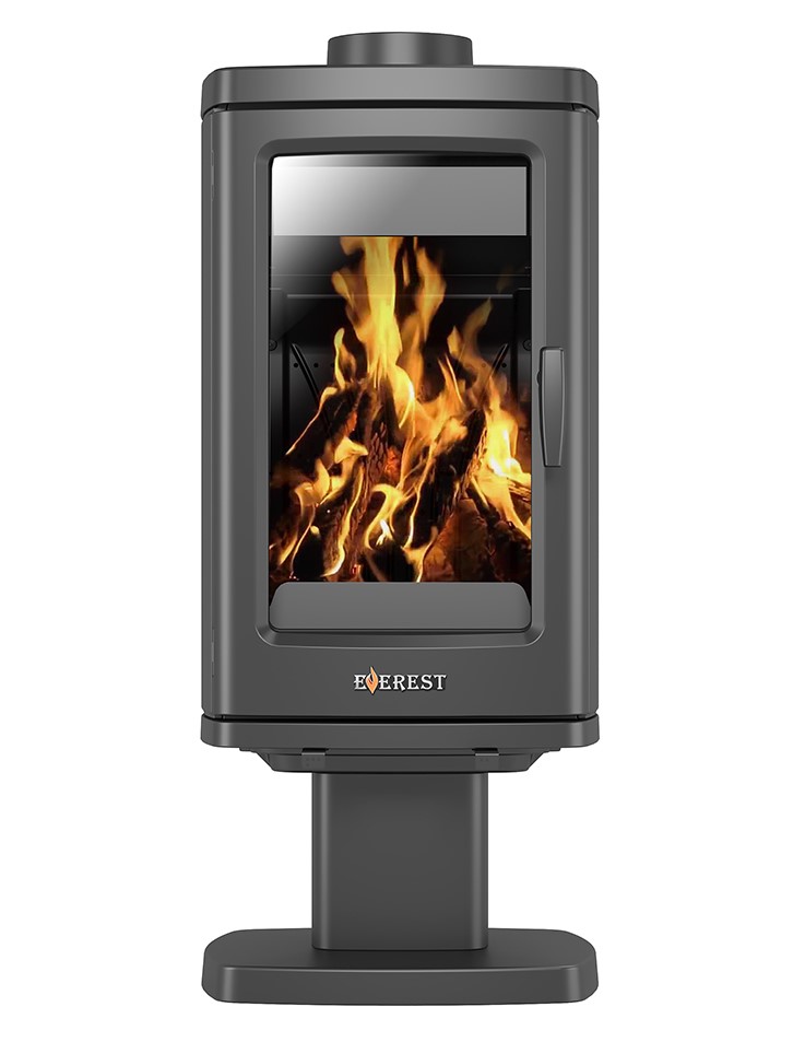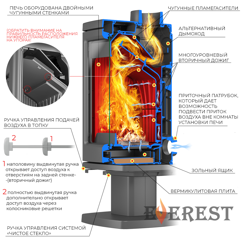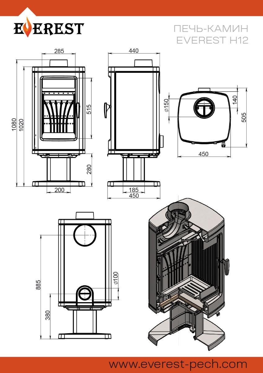 Конструкция: Печь-камин Everest H12 состоит из вытянутой вверх чугунной топки на колонне-опоре, закрывающийся чугунной дверкой с обзорным стеклом и системой "Чистое стекло". Горение дров происходит на колосниковой решётки, под колосниковой решёткой установлен зольный ящик, под колосниковым ящиком плита вермикулита, для снижения тепловой нагрузки на колонну-опору. Everest H12 имеет нижнюю подачу воздуха, через колосниковую решётку и верхнюю, через несколько рядов отверстиё на задней стенки топки и отбойника пламени. Everest H12 снабжён патрубком диаметром 100мм. для подключения воздуховода, для забора воздуха, необходимого для горения дров, с улицы. Такая конструкция обеспечивает более полное сгорание дров и повышает КПД печи-камина и не выжигает кислород из помещения. Топливо: Печь - камин Everest H12 топится сухими дровами или древесными брикетами. Особенности: Everest H12 — классическая форма топки на колонне-опоре, надёжности и высокий КПД.
