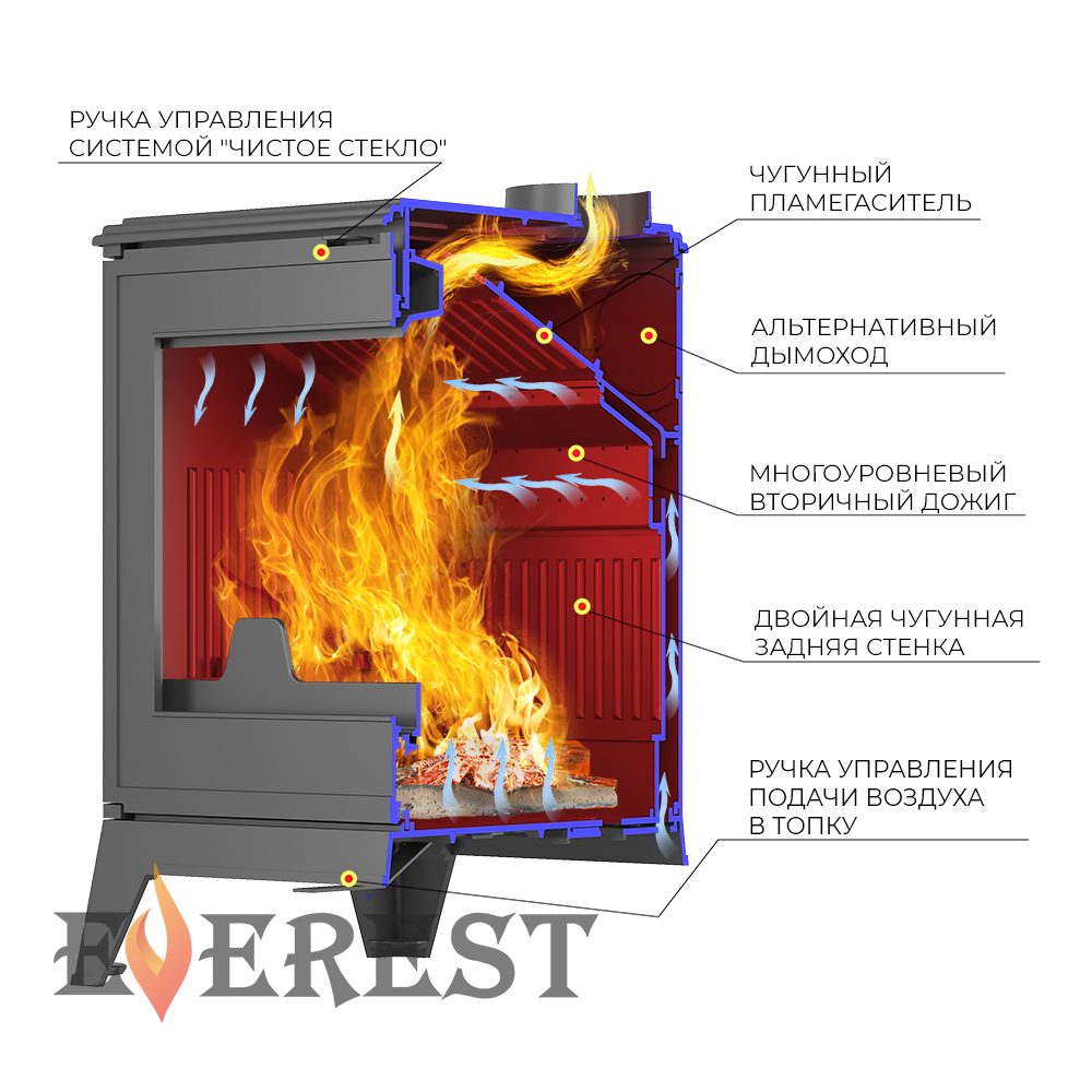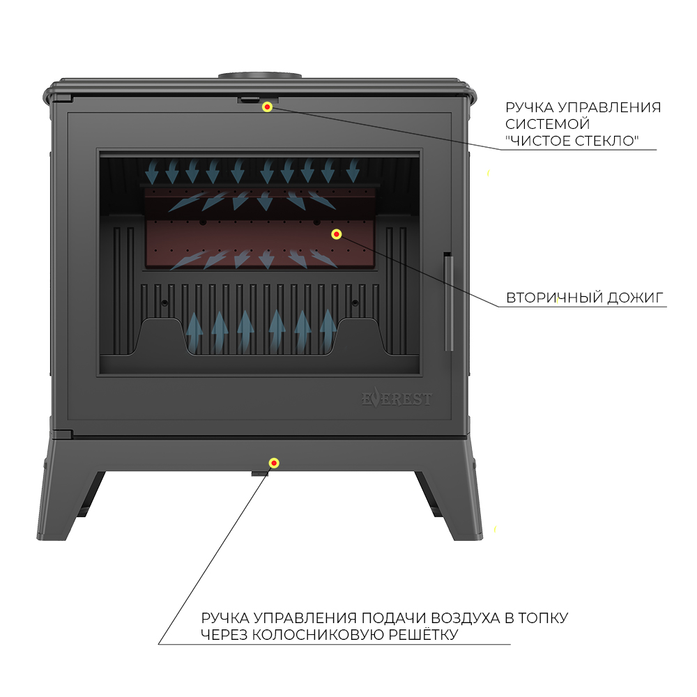 Пламегаситель: выполнен из жаростойкого чугуна. Под пламегасителем отверстия системы многоуровневой подачи вторичного воздуха. Регулировка системы подачи воздуха вторичного дожига осуществляется заслонкой в нижней части печи.