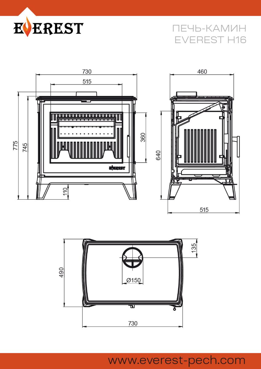 Печь-камин EVEREST Н16 изготовлена из высококачественного жаростойкого чугуна с толщиной стенок 6–8 мм. Задняя стенка топки двойная. Модель предназначена для дровяного отопления помещений объёмом до 320 м³.