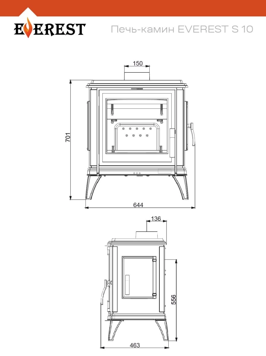 Печь-камин Everest S10 изготовлена из высококачественного жаростойкого чугуна толщиной стенок 6–8 мм. Задняя стенка топочной камеры усилена чугунной вставкой. Модель предназначена для дровяного отопления помещений объёмом до 240 м³.