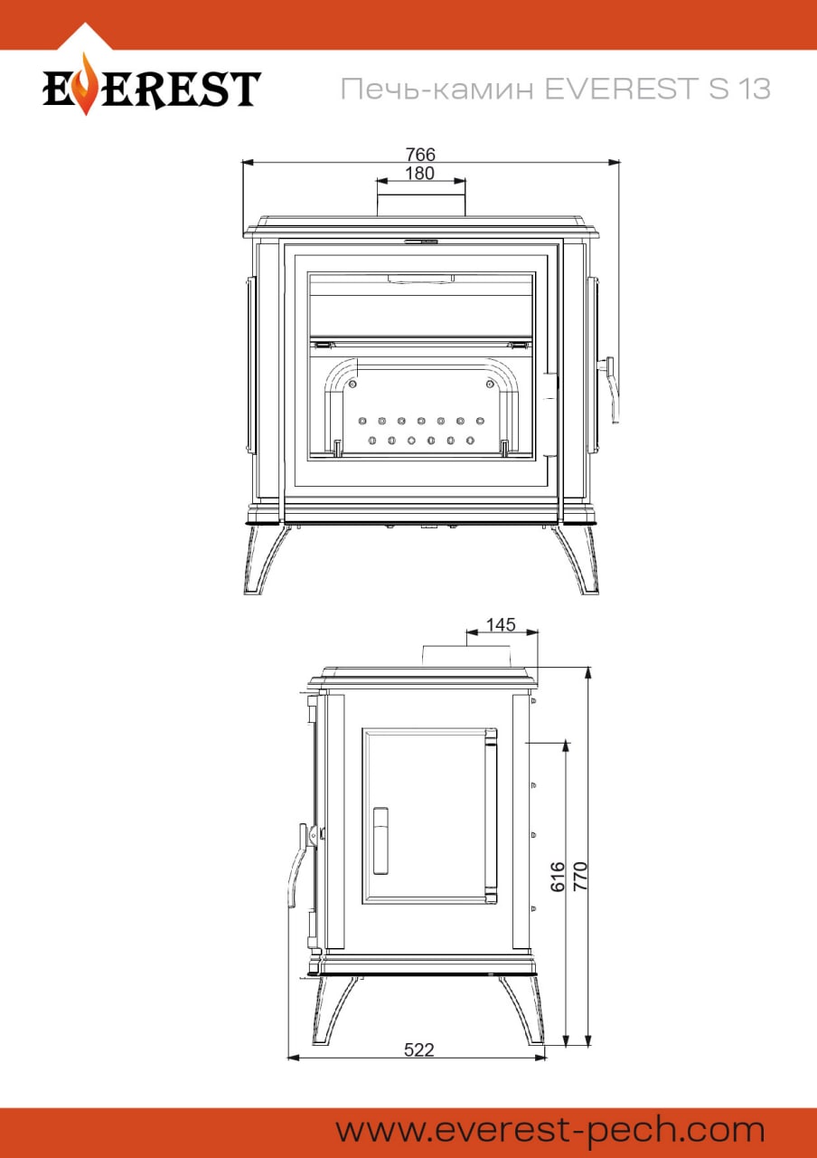 Печь-камин Everest S13 изготовлена из высококачественного жаростойкого чугуна толщиной стенок 6–8 мм. Задняя стенка топочной камеры усилена чугунной вставкой. Модель предназначена для дровяного отопления помещений объёмом до 320 м³.
