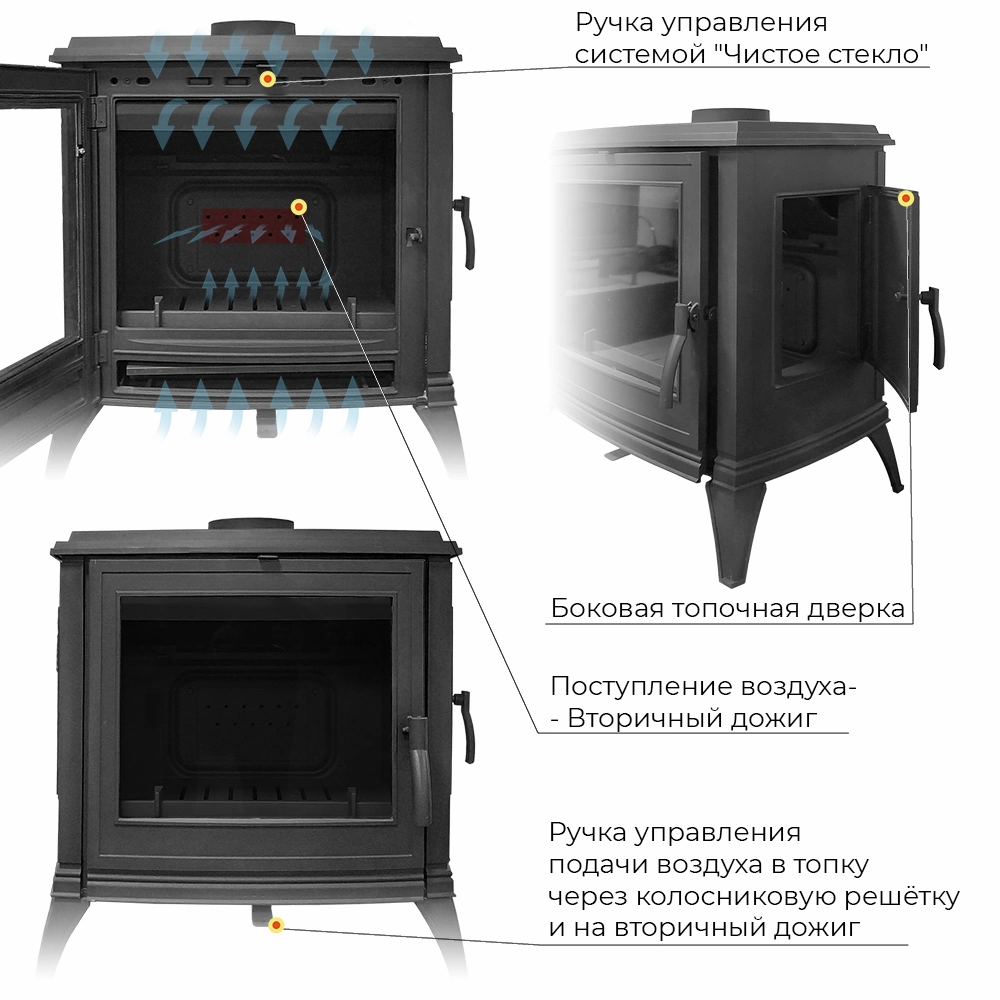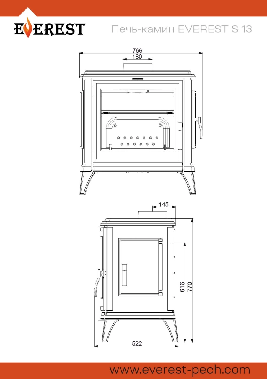 Пламегаситель: выполнен из чугуна. Под пламегасителем находятся два уровня отверстий подачи вторичного воздуха. Регулировка системы подачи воздуха вторичного дожига осуществляется заслонкой в нижней части печи. Топка Печи-камина Everest S13 дополнена второй дверкой для закладки дров справой стороны.
