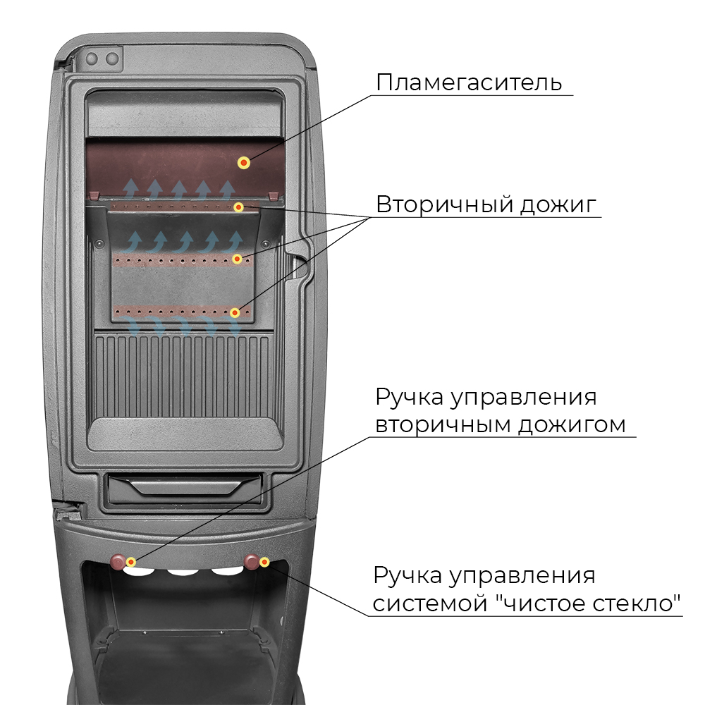 Конструкция: Everest S7 состоит из округлой, вытянутой вверх, чугунной топки на чугунном основании, закрывающийся чугунной дверкой с обзорным стеклом и системой "Чистое стекло". Горение дров происходит на колосниковой решётки, под колосниковой решёткой установлен зольный ящик. Everest S7 имеет первичную подачу воздуха, через колосниковую решётку и вторичную, через отверстия на задней стенки топки. Такая конструкция, в сочетании с системой газохода, обеспечивает более полное сгорание дров и повышает КПД. Забор воздуха, для горения дров, может производится с улицы, для этого на задней стенки предусмотрен специальный патрубок диаметром 100мм. Топливо: Печь - камин Everest S7 топится сухими дровами или древесными брикетами. Особенности: Everest S7 — сочетание технологий, дизайна и надёжности для отопления вашего дома.