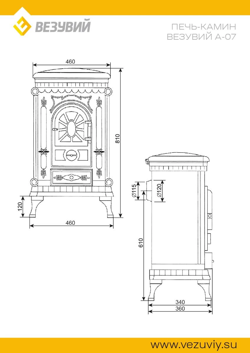 Конструкция: Печь-камин Везувий А-07 состоит из вертикальной чугунной топки на небольших ножках, закрывающийся чугунной дверкой с обзорным стеклом с декоративной решеткой. Топка содрана из чугунных деталей, соединенных болтами. Стыки деталей уплотнены термостойким герметиком. Верхняя плоскость топки снабжена съёмной варочной конфоркой, диаметром 23см. Конфорка закрывается откидной декоративной, чугунной решеткой. Горение дров происходит на колосниковой решётки, под колосниковой решёткой установлен зольный ящик. Топливо: Печь-камин Везувий А-07 топится сухими дровами или древесными брикетами. Особенности: Печь-камин Везувий А-07 — компактные размеры, в элегантном корпусе с элементами художественного литья и универсальность.