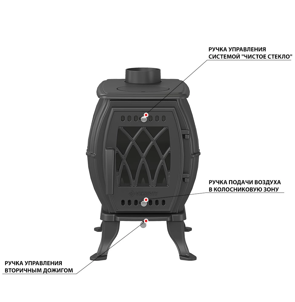 Конструкция: Печь-камин Везувий BX-05 состоит из округлой чугунной топки на небольших ножках, закрывающийся чугунной дверкой с обзорным стеклом и системой "Чистое стекло". Горение дров происходит на колосниковой решётки, под колосниковой решёткой установлен зольный ящик. Печь-камин Везувий BX-05 имеет нижнюю подачу воздуха, через колосниковую решётку и двухуровневую, вторичную, через отверстия на задней стенки топки и отбойнике пламени. Такая конструкция обеспечивает более полное сгорание дров и препятствует налипанию сажи на стекло. Топливо: Печь-камин Везувий BX-05 топится сухими дровами или древесными брикетами. Особенности: Печь-камин Везувий BX-05 — современный конструктив, компактные размеры, красивый дизайн.