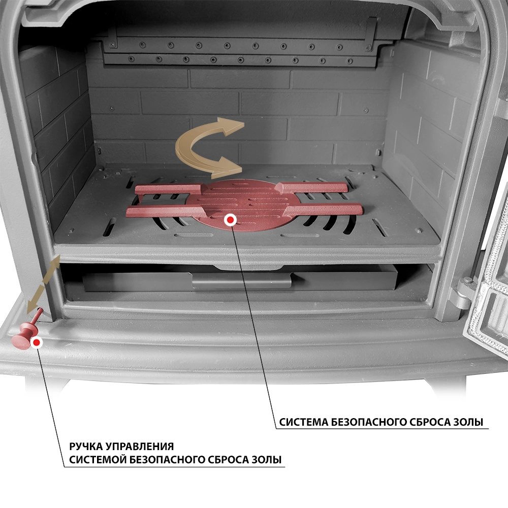 Над дверцей печи-камина расположена система «чистое стекло», которая помогает поддерживать стекло чистым. В нижней части дверцы находятся две ручки для регулировки подачи воздуха в колосниковую зону, что позволяет контролировать интенсивность горения. Нижняя часть топки дополнена колосниковой решёткой, которую можно приводить в движение с помощью ручки, вынесенной на внешнюю часть корпуса печи. Благодаря этой функции удобно сбрасывать золу в зольный ящик.