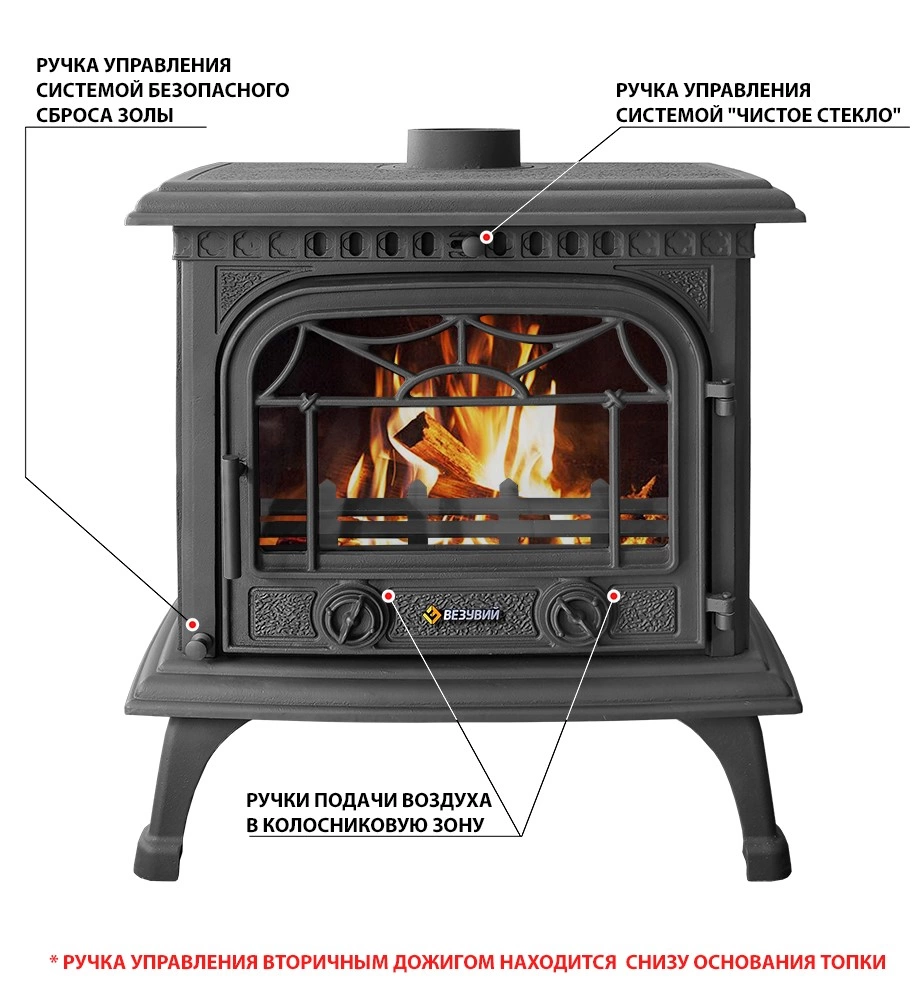 В печи-камине Везувий HR-15 предусмотрена система вторичного догорания. Благодаря этой функции кислород поступает через каналы подачи вторичного воздуха, нагревается между двойными стенками топочной камерой и через дефлекторы поступает в топку, перемешиваясь с газами, инициируя их горение. Регулировка системы осуществляется рычагом, расположенным в нижней части печи.