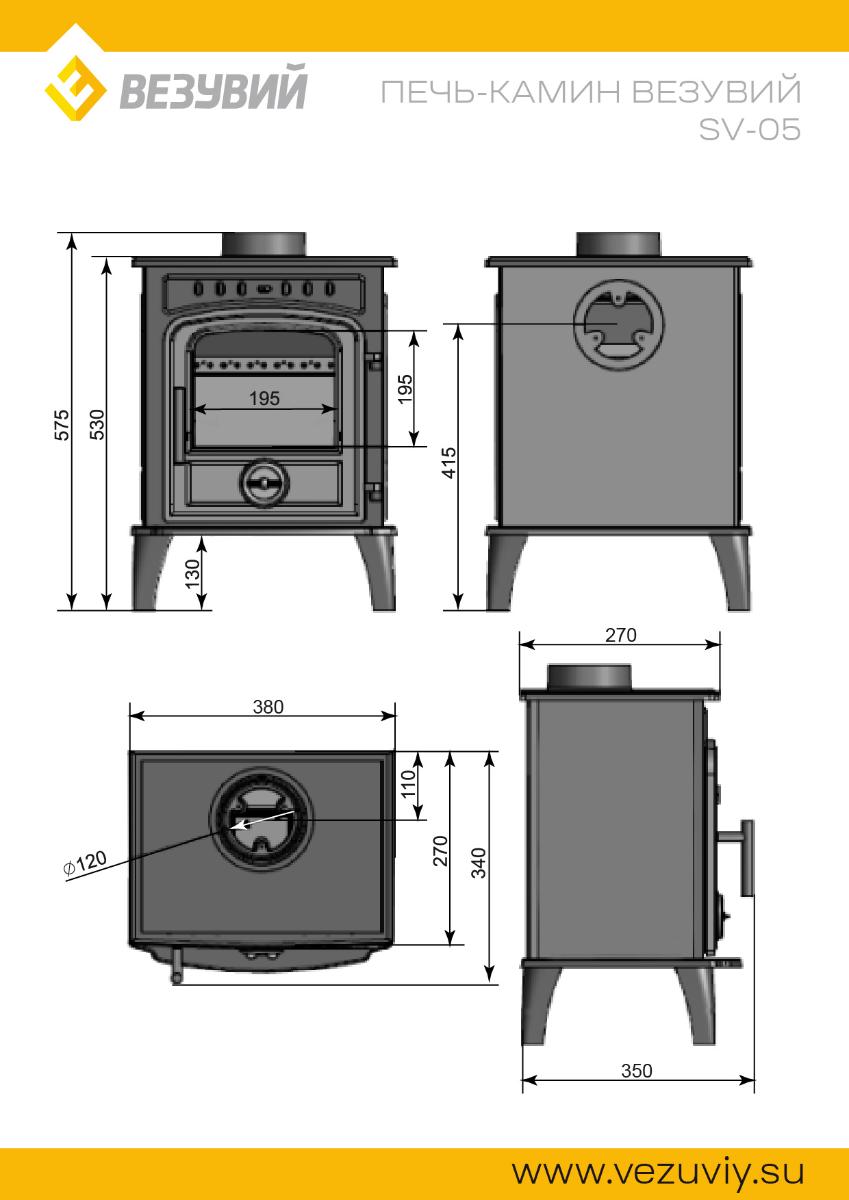 Конструкция: Везувий SV-05 Антрацит состоит из прямоугольной топки на ножках, закрывающийся чугунной дверкой с обзорным стеклом. Дверка дополнена системой "Чистое стекло". Горение дров происходит на колосниковой решётки, под колосниковой решёткой установлен зольный ящик, под зольным ящиком теплоизоляция из листового вермикулита, для снижения тепловой нагрузки на основание печи-камина. Везувий SV-05 Антрацит имеет нижнюю подачу воздуха, через колосниковую решётку и верхнюю, вторичную подачу воздуха, через отверстия на задней стенки топки. Такая конструкция обеспечивает более полное сгорание дров и повышает КПД печи. Топливо: Печь - камин Везувий SV-05 Антрацит топится сухими дровами или древесными брикетами. Особенности: Везувий SV-05 Антрацит — минимальные размеры, не большая мощность и современные технологии.
